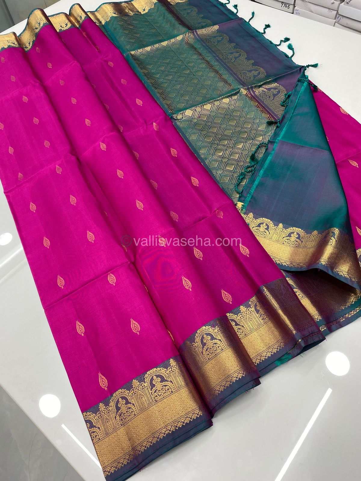 Pure Soft Silk Saree.Double warp with soft finish , light weight saree, All over butta, contrast kanchi border.Contrast Rich Pallu and Contrast Blouse.