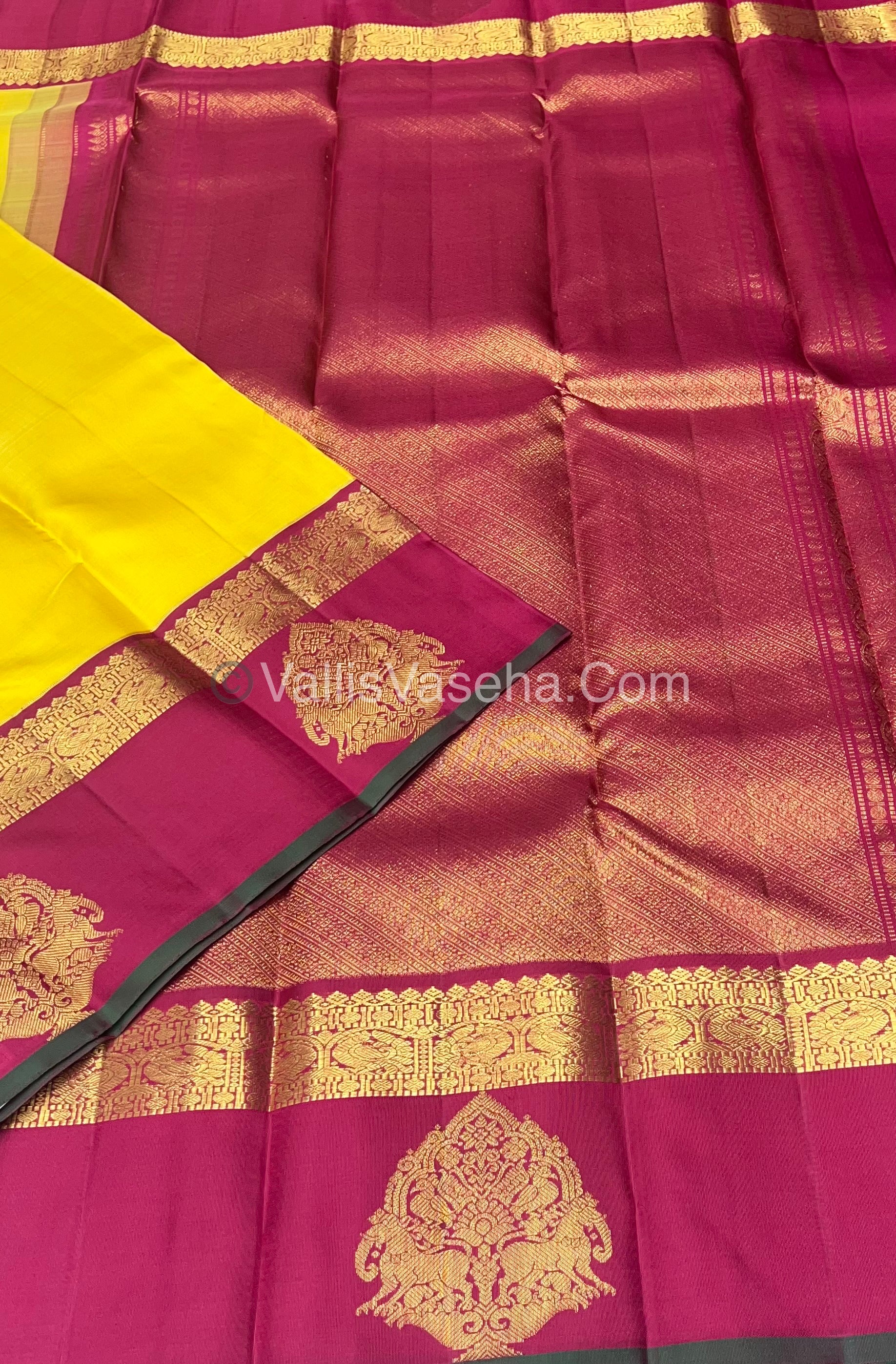 Pure Kanchipuram Vinatge Collection - yellow & maroon combo with all over plain saree with contrast rich border, contrast rich pallu and contrast blouse with border for sleeves.