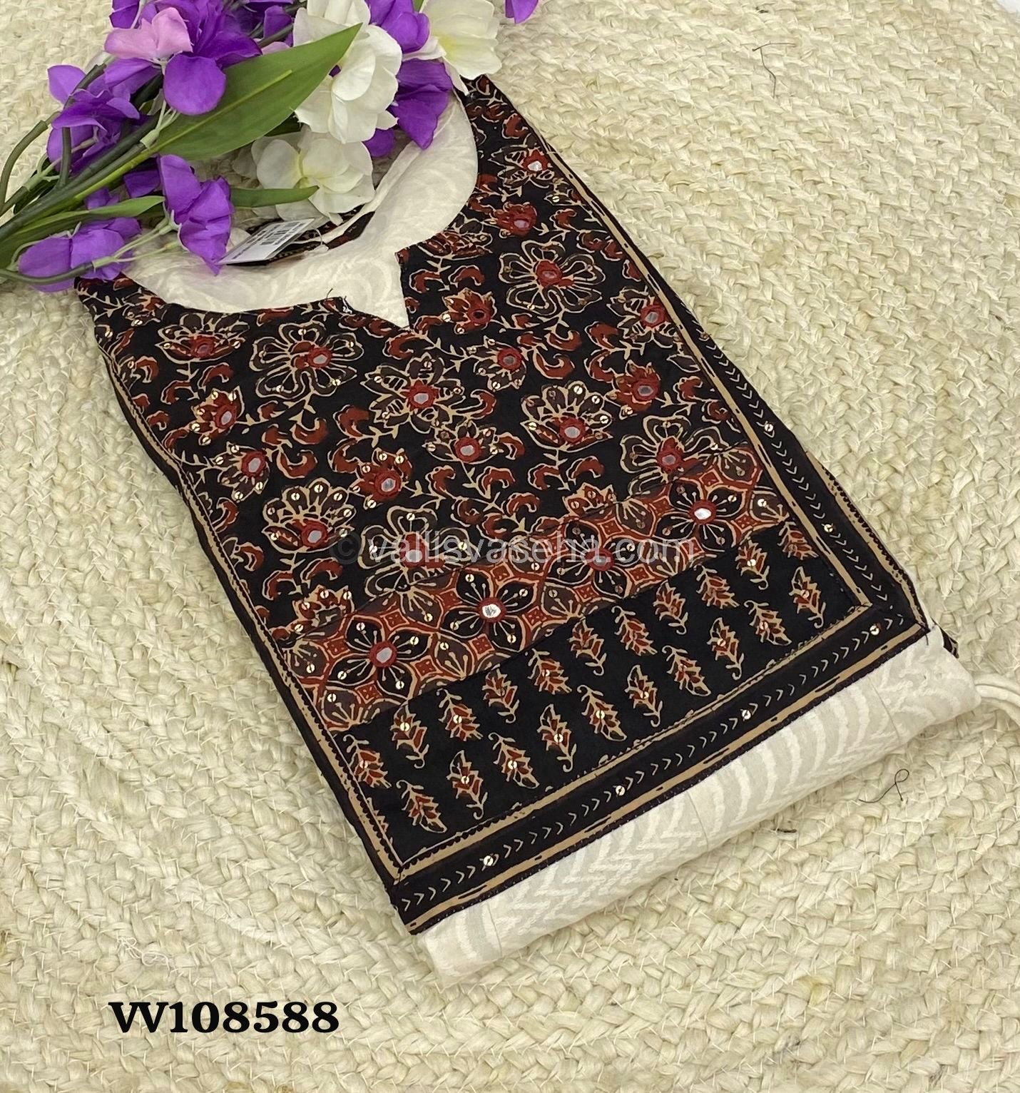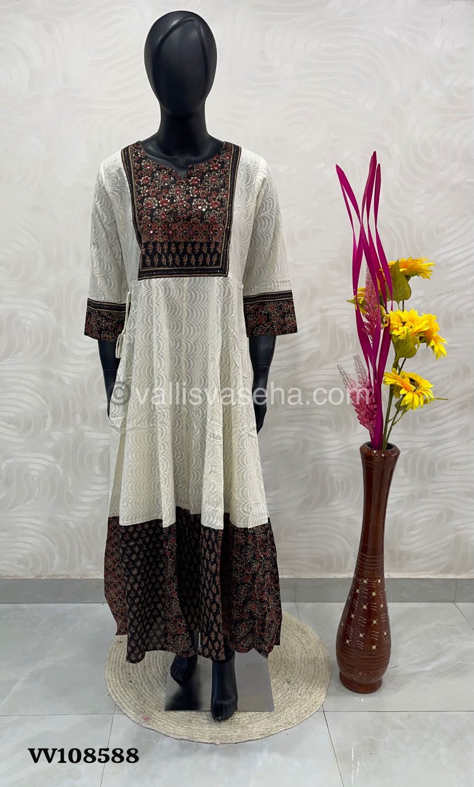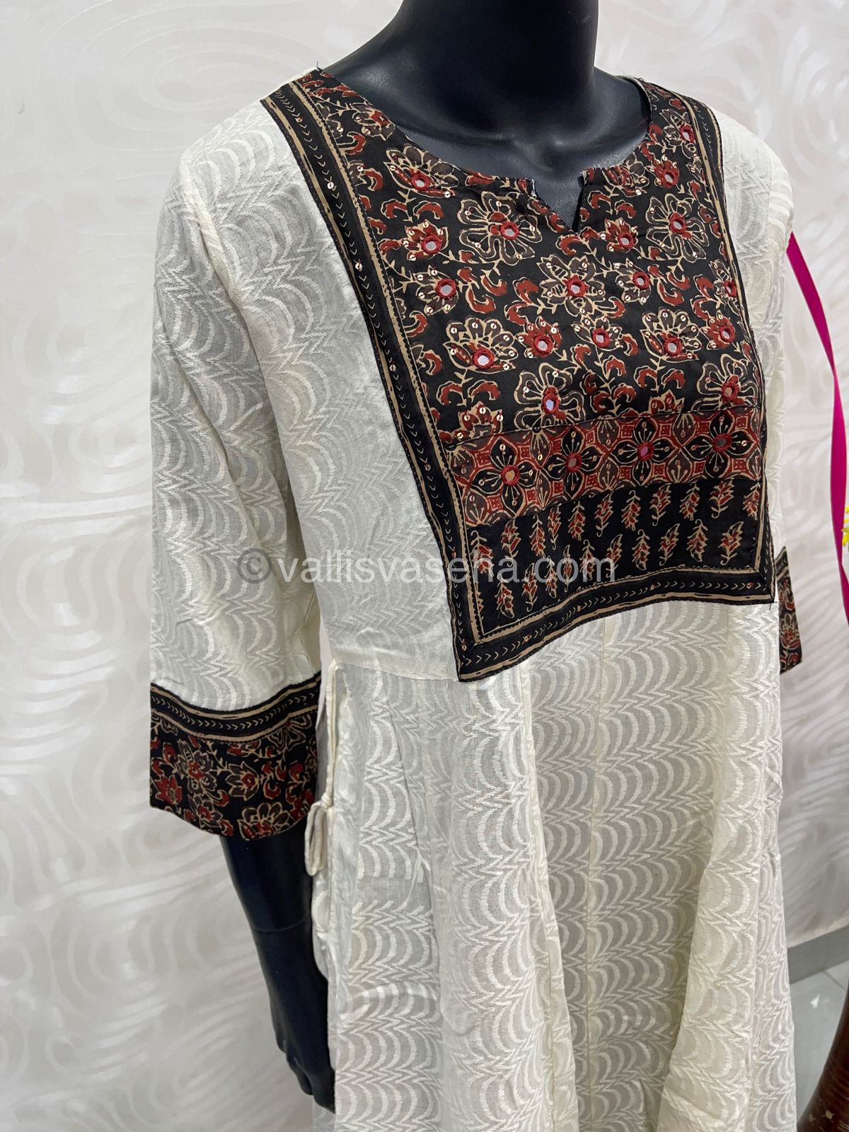 Ready Made - Long Floor Length Kurti - Cream with Black Ajrakh Combo - VVRLG001