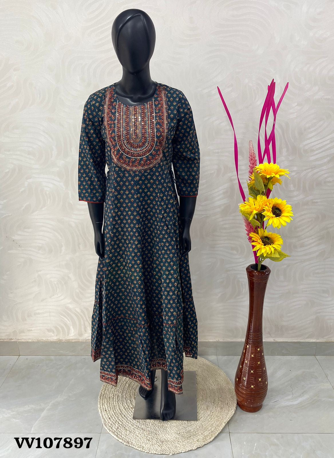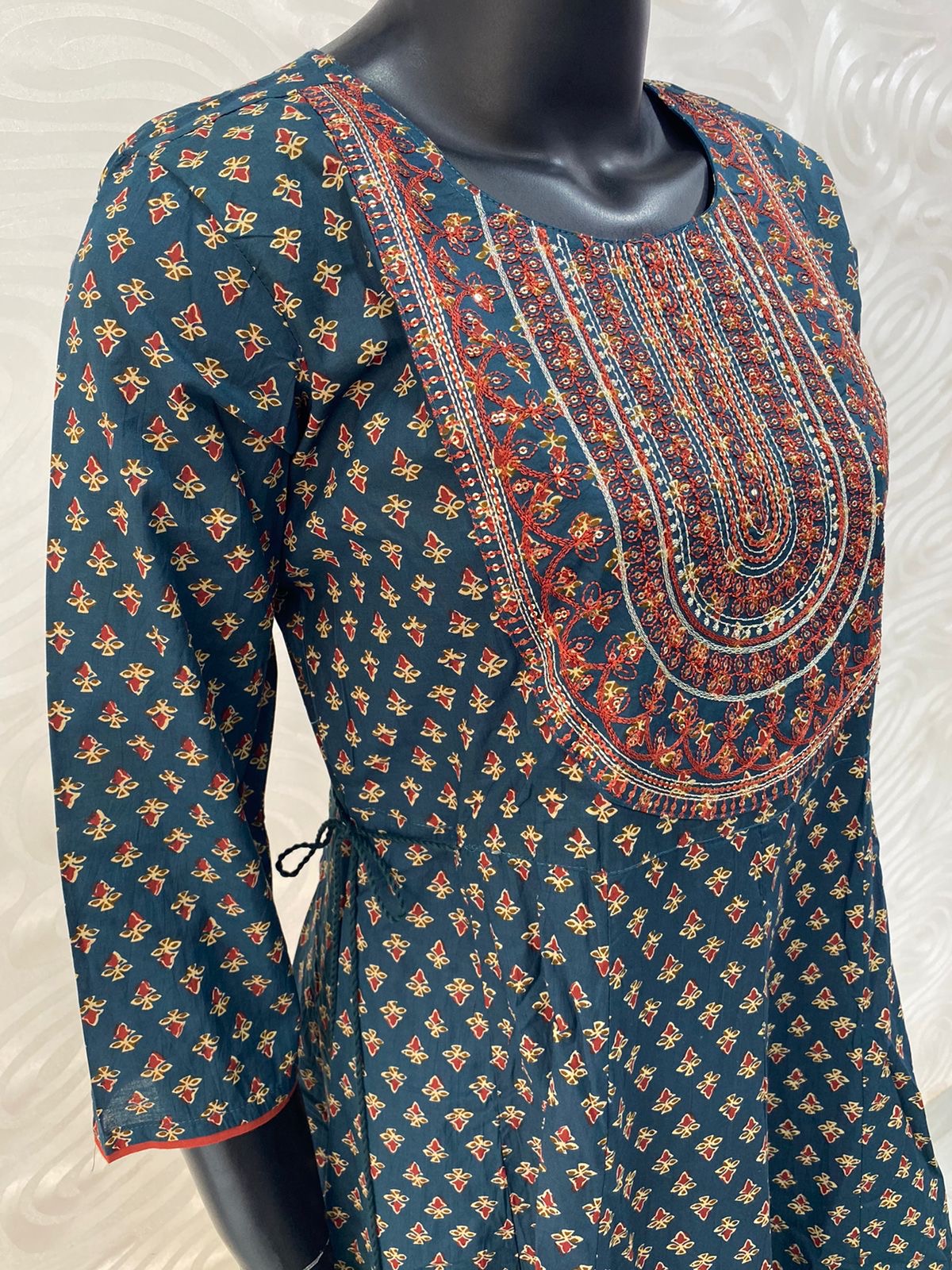 Long Floor Length Kurti - Mixed Cotton - Yoke Embroidery With 3/4th Hand sleeves . Only Kurti - Regular Wear / Office Wear / Party Wear