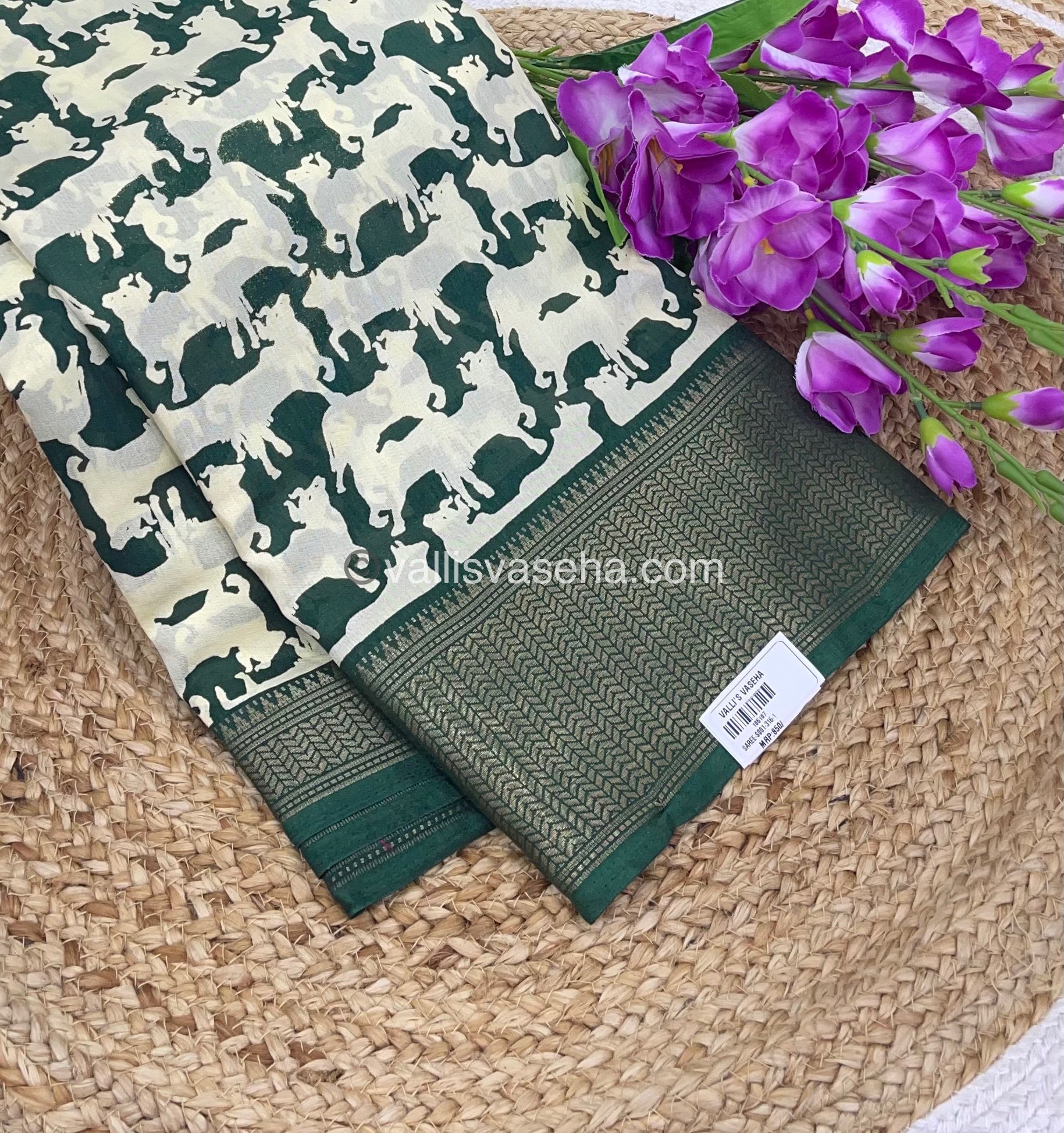 Semi Binny Silk / Semi Dola Silk saree with Pitchwai Print all over the saree and Banarasi border in both sides and with printed Pallu & printed Blouse.