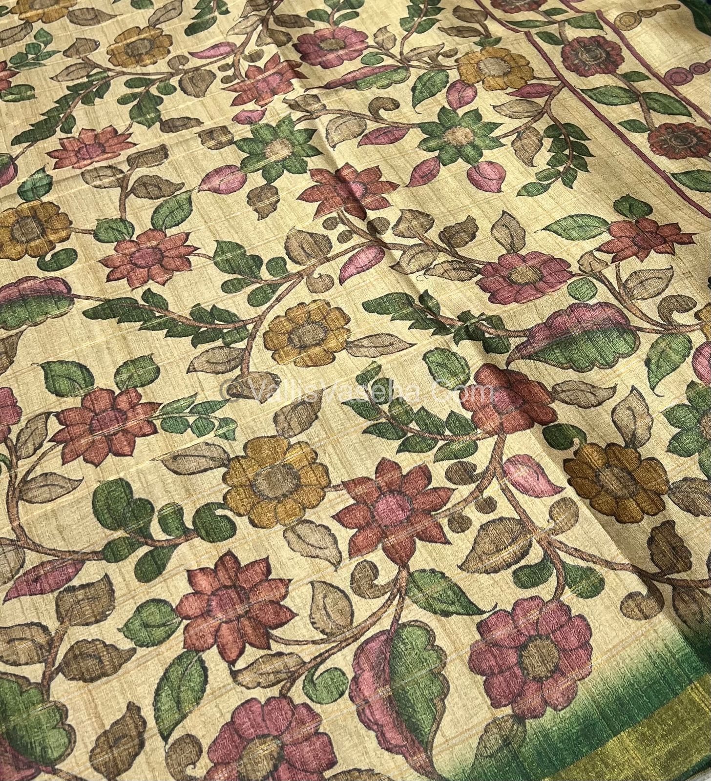 Soft & Smooth flowy Texture - Semi Gicha Tussar Silk Saree with all over Zari Checks designs and small strip of  Border . Kalamkari  Printed Pallu With Tassels  & Kalamkari Printed Blouse .Light weight Saree . Good for Office / Casual Wear