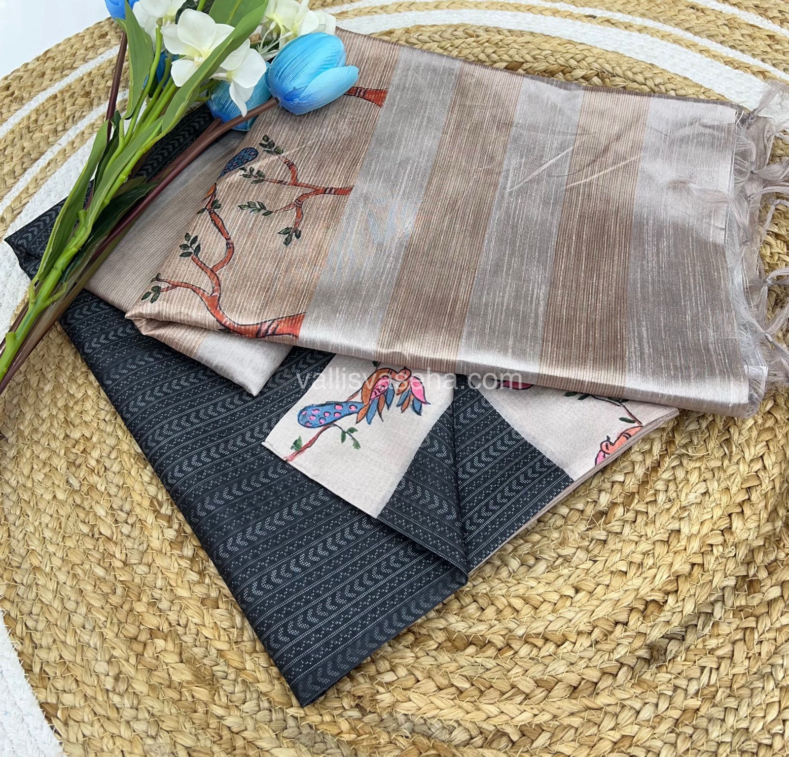 Semi Chappa Silk saree with contrast cream border with double peacock print , Elegant Printed Pallu with tassels & Peacock Printed Blouse.