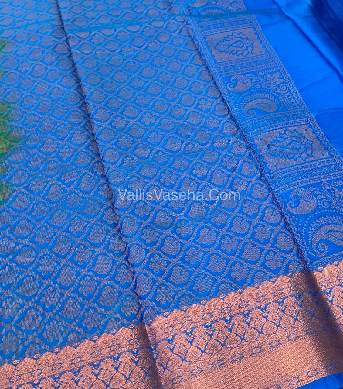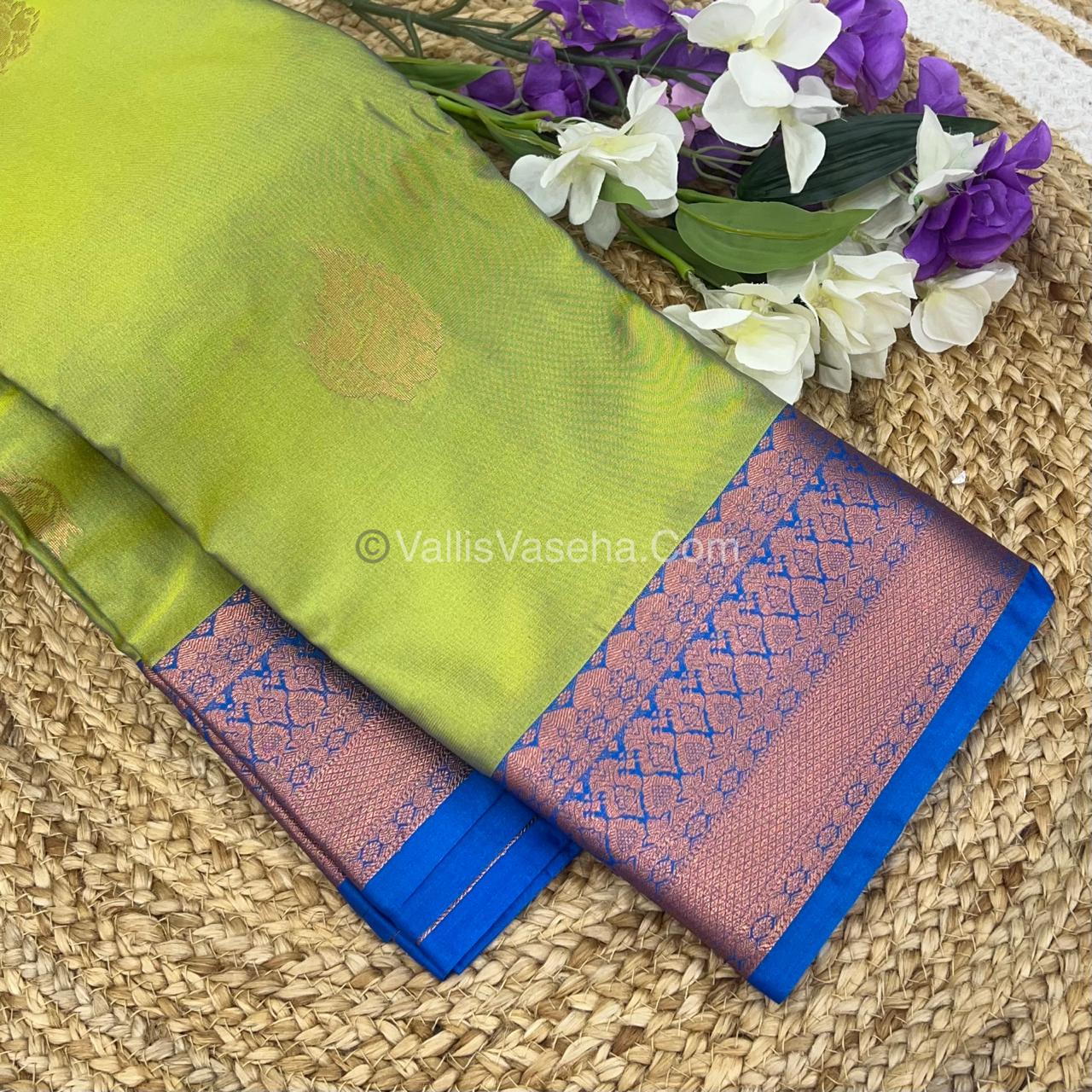 Kanchi Semi Soft Silk Saree. Very soft texture. Lovely Color shades .All over Butta , Rich Contrast Pallu and contrast blouse with border for sleeves . Good for gifting.
