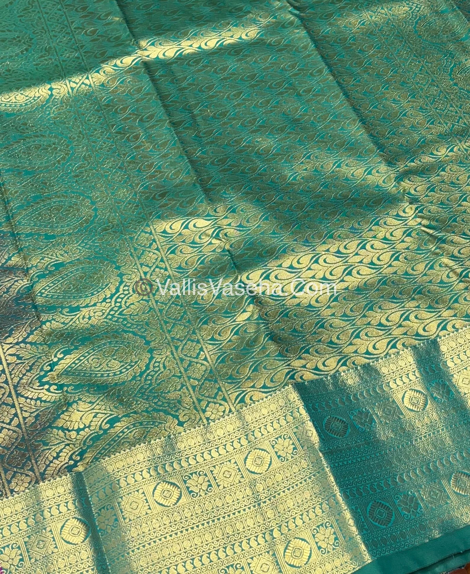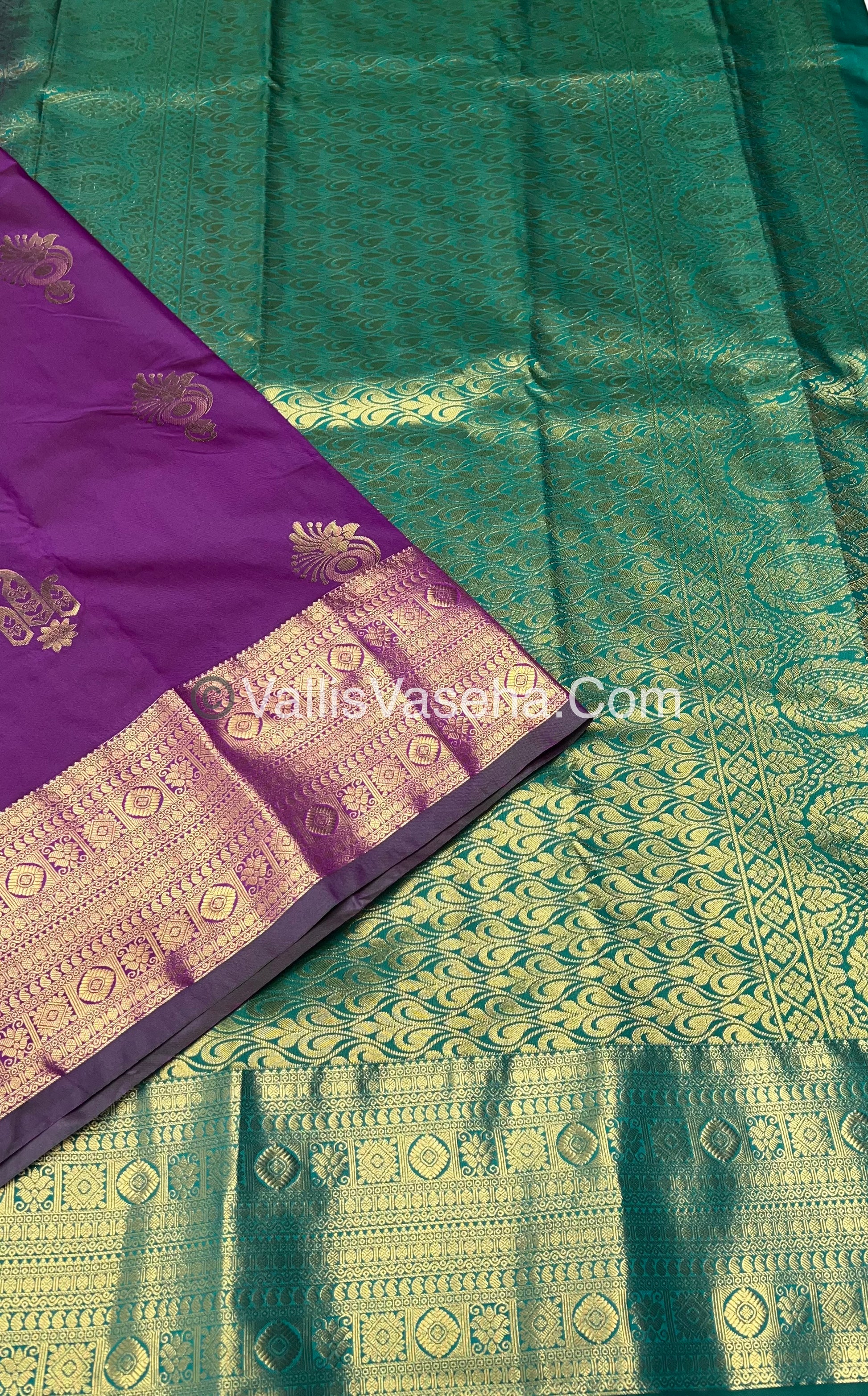 Semi Kanchipuram Soft Silk Saree. Very soft texture. Lovely Color shades .All over Butta , Rich Contrast Pallu and contrast blouse with border for sleeves . Good for gifting.