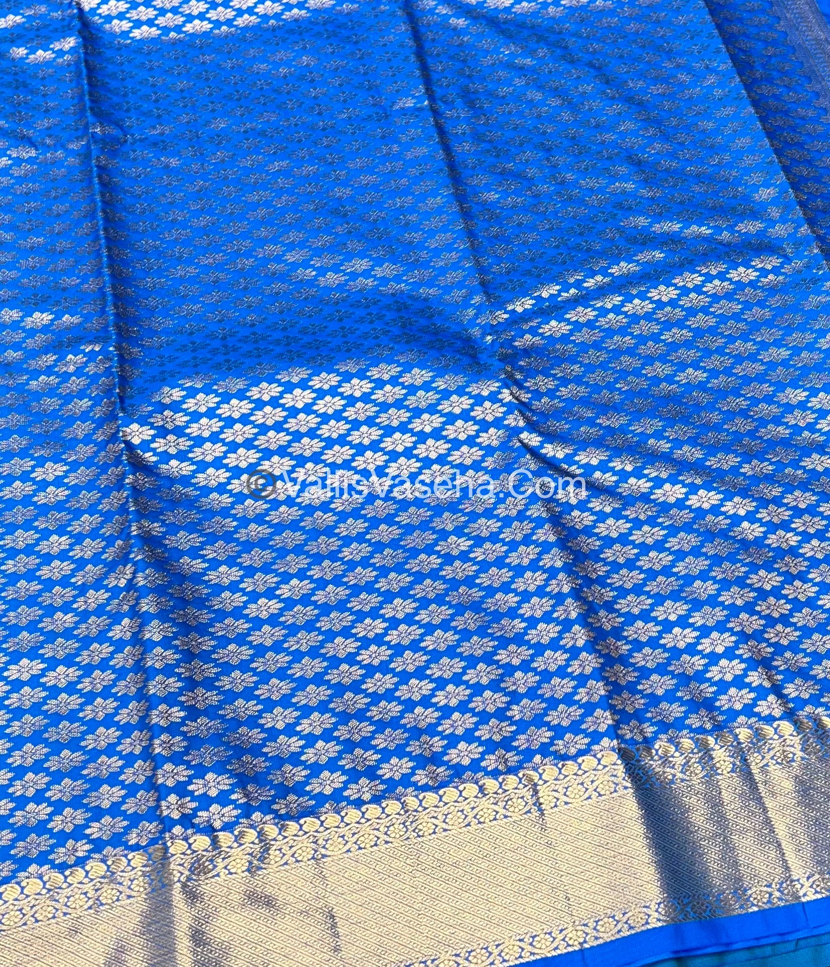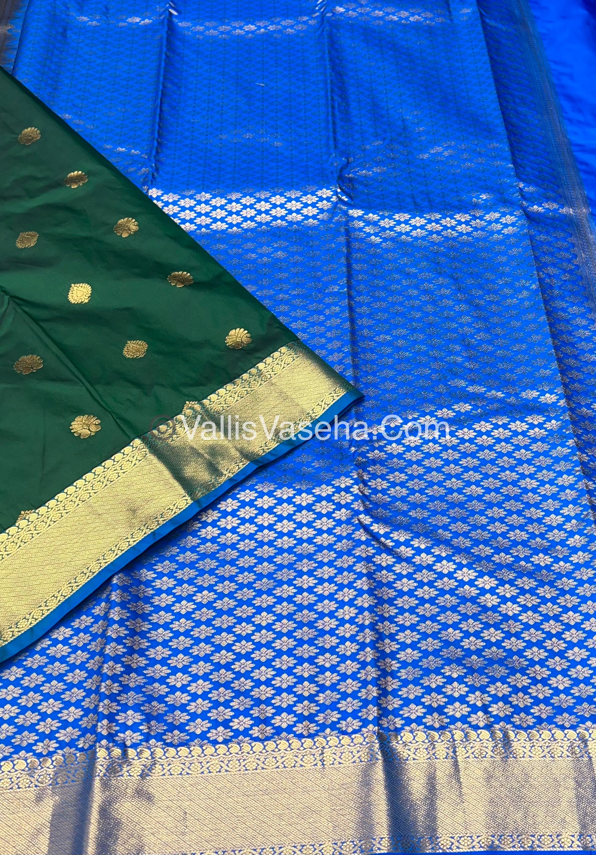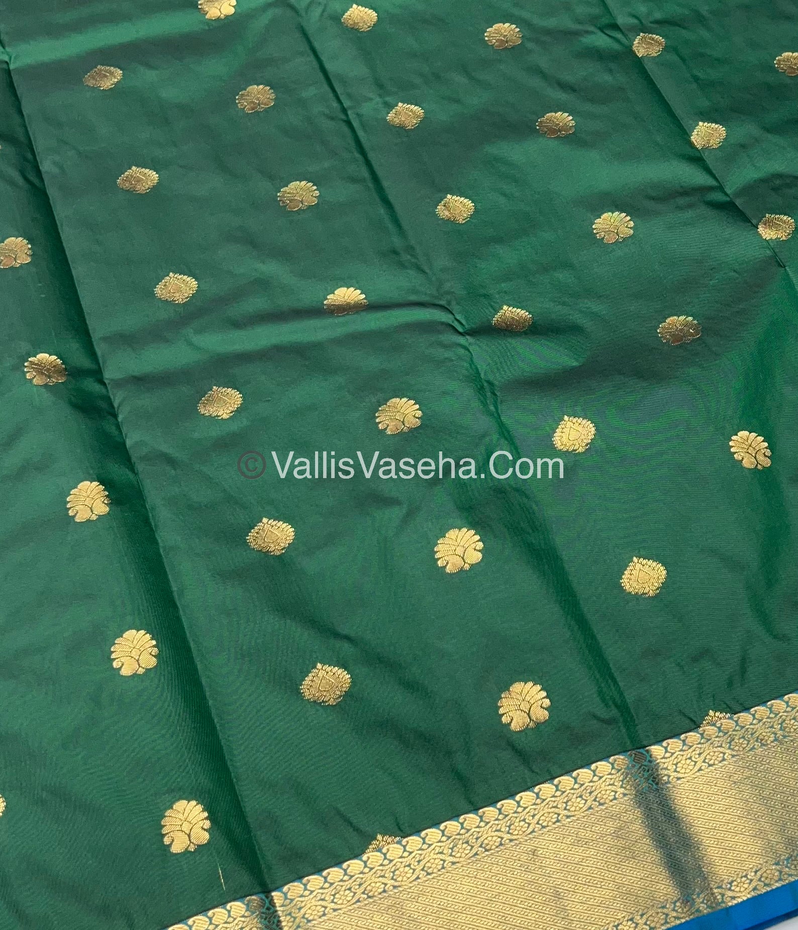 Semi Kanchipuram Soft Silk Saree. Very soft texture. Lovely Color shades .All over Butta , Rich Contrast Pallu and contrast blouse with border for sleeves . Good for gifting.
