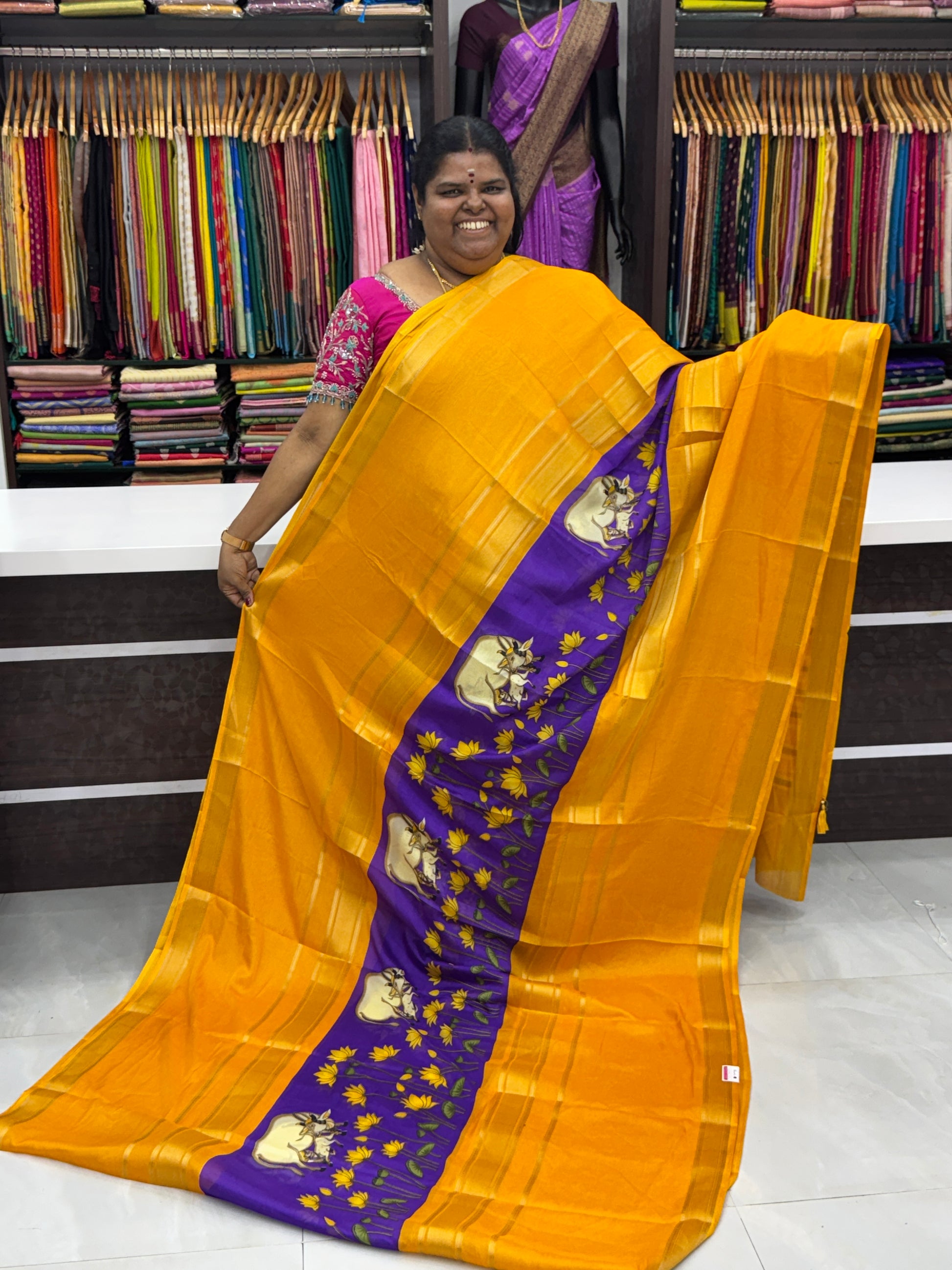 Semi Mysore Crepe Silk variety - Middle Pichwai Print - Both side same borders .