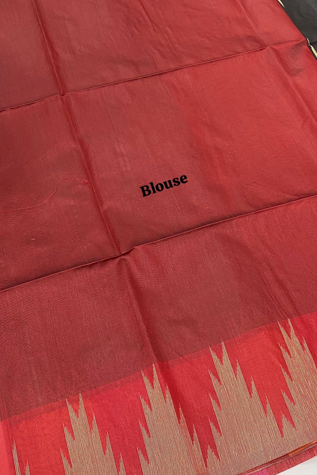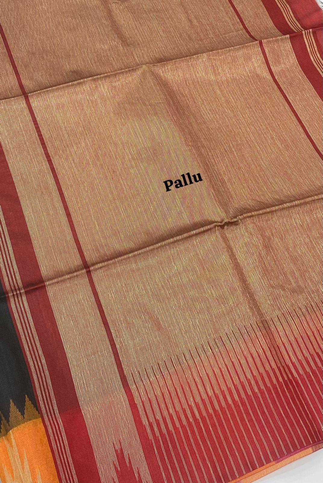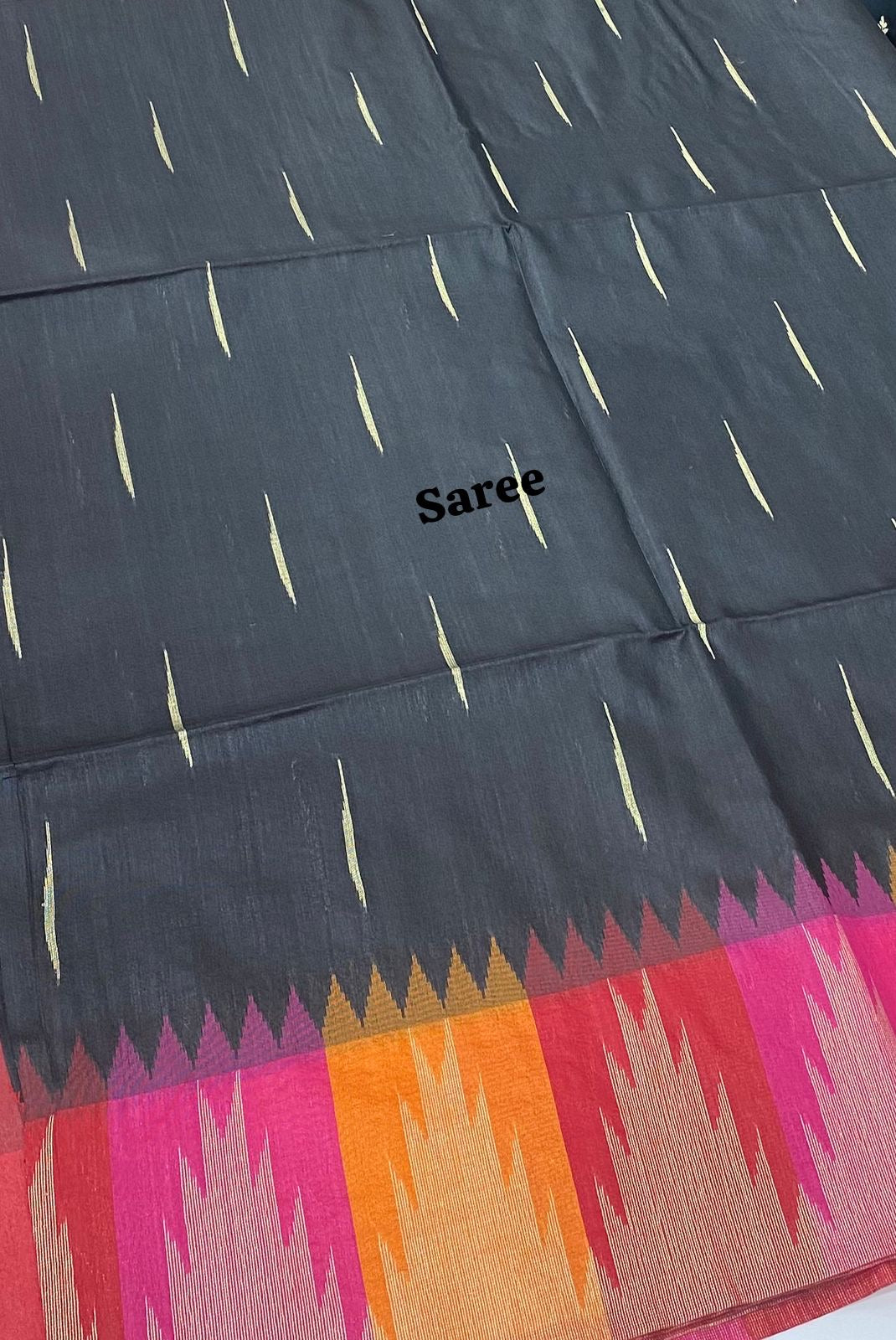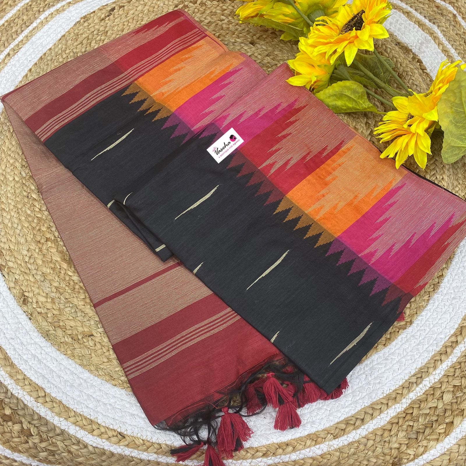 Semi Raw Silk with all over Rain drop design Weaving and Multi color temple woven borders with grand pallu with tassels and Blouse with temple design border for sleeves.