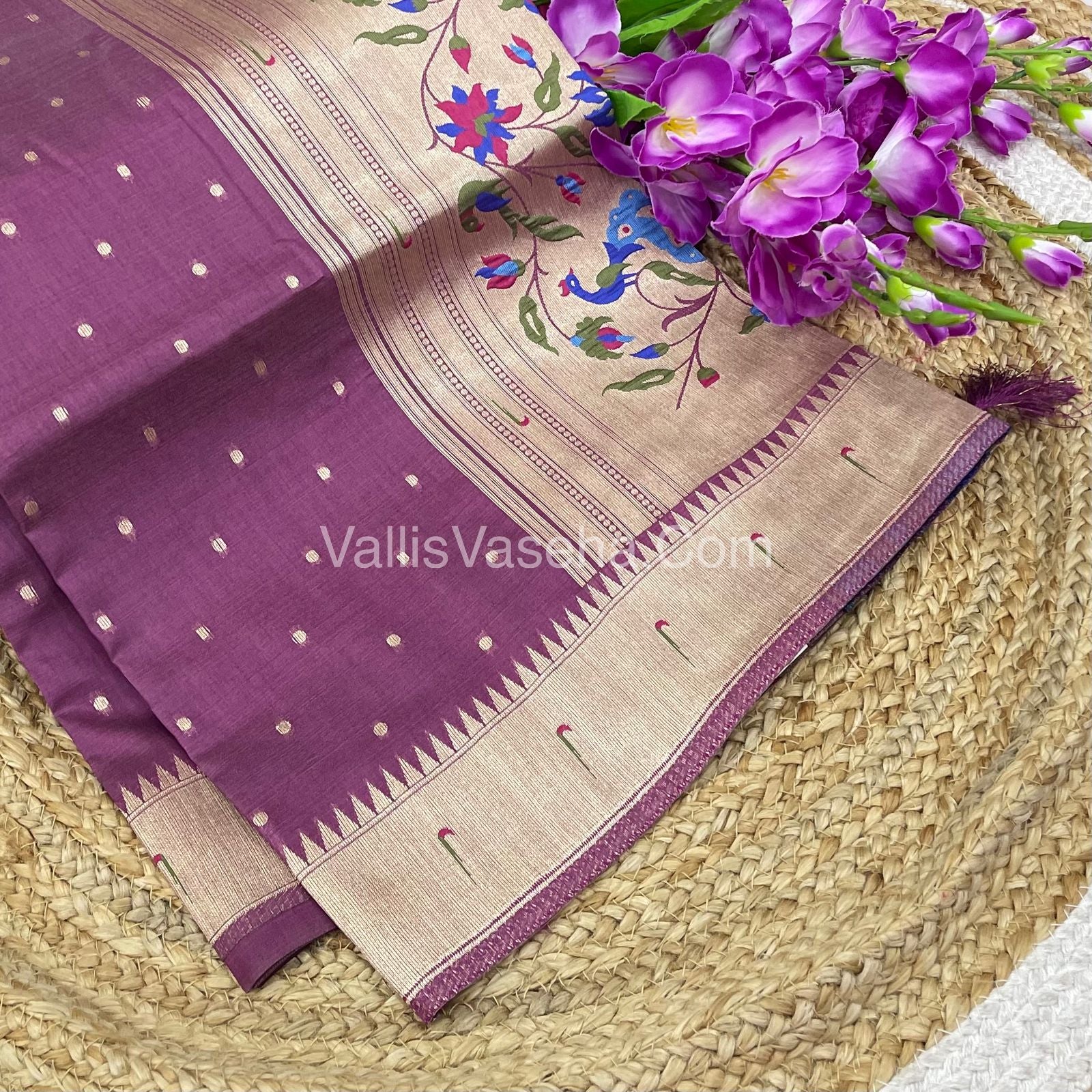 Semi Raw Silk saree with all over polka dots Butta and beautiful Paithani design Weaving border , Paithani design Rich pallu with tassels and Grand Paithani blouse.