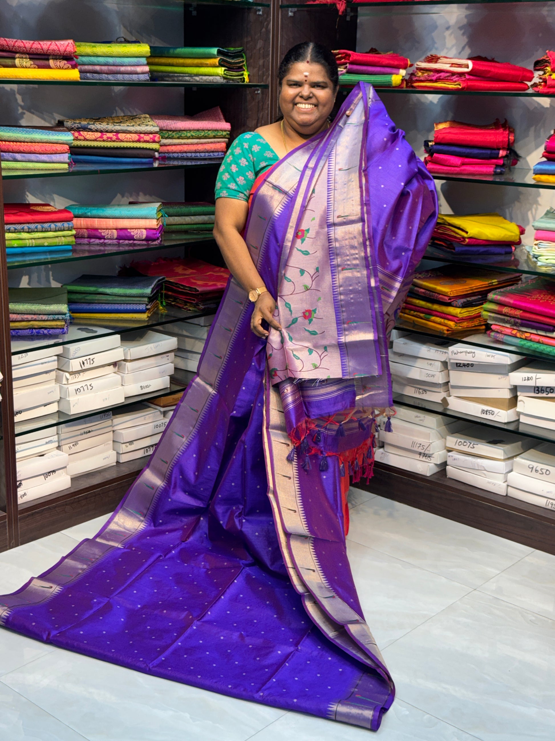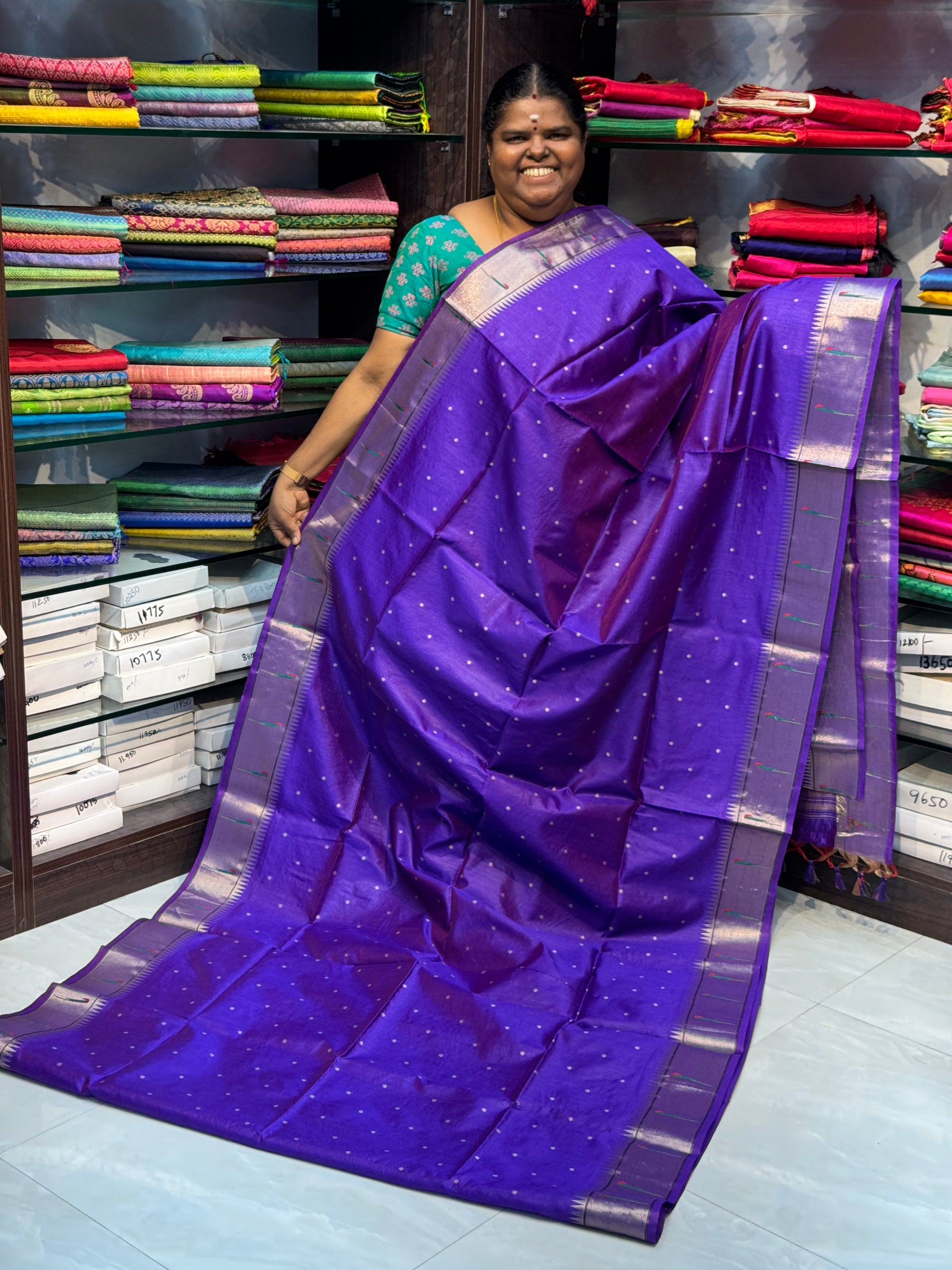 Semi Raw Silk saree with all over polka dots Butta and beautiful Paithani design Weaving border , Paithani design Rich pallu with tassels and Grand Paithani blouse.