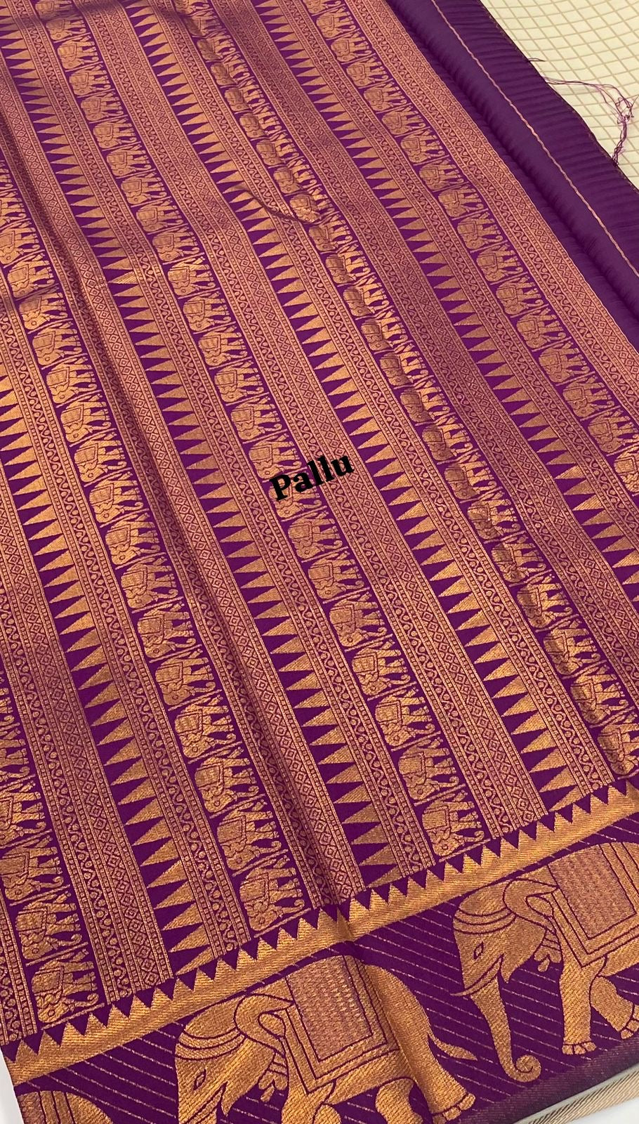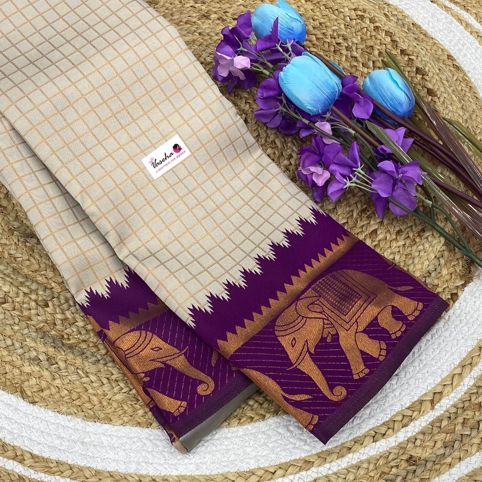 Semi Silk Saree - Kanchi Silk Style - Elephant Border - Creamish Grey with Purple - VVSSS005
