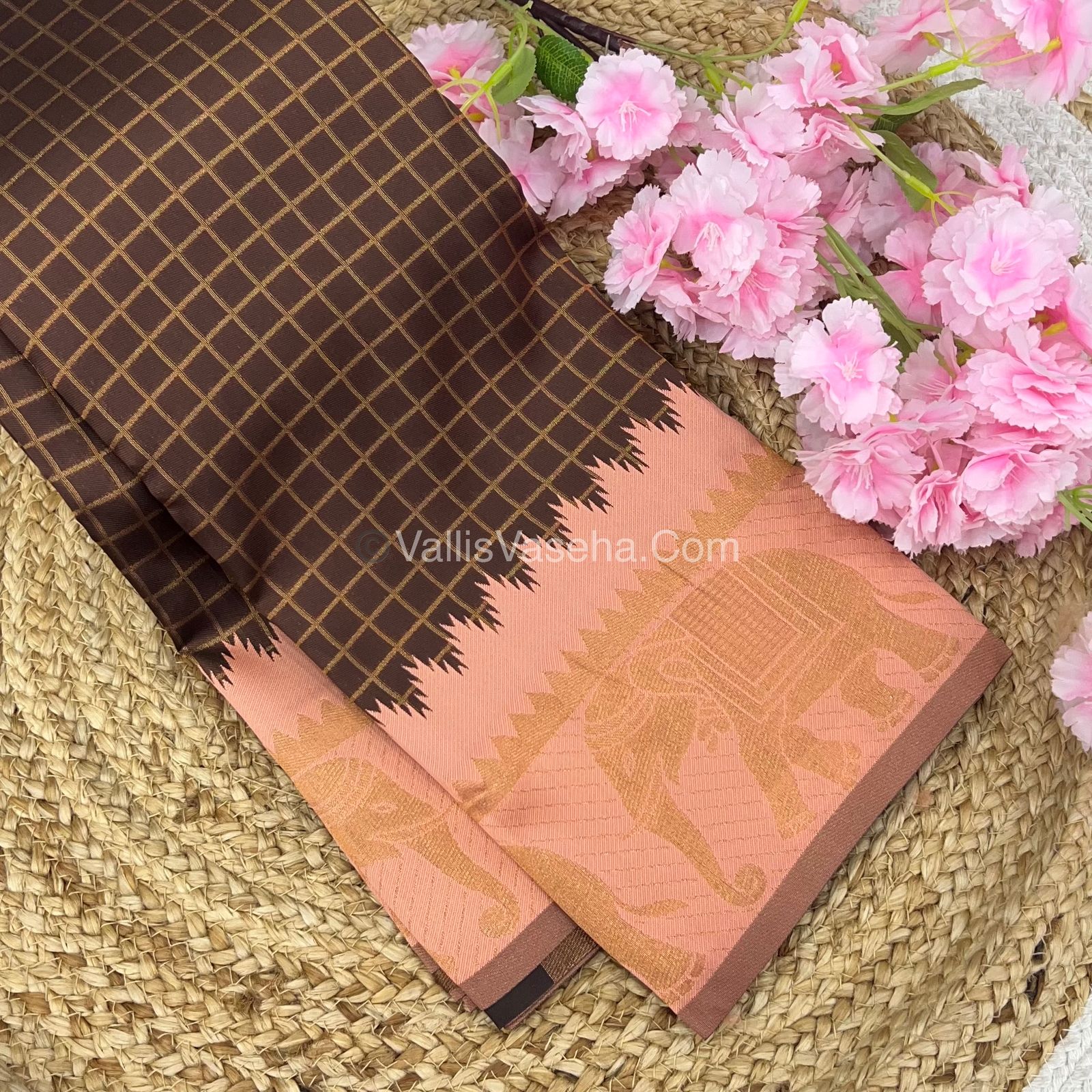 Semi Silk Saree - Kanchi Silk Style - Elephant Border - Brown with Peach - VVSSS005
