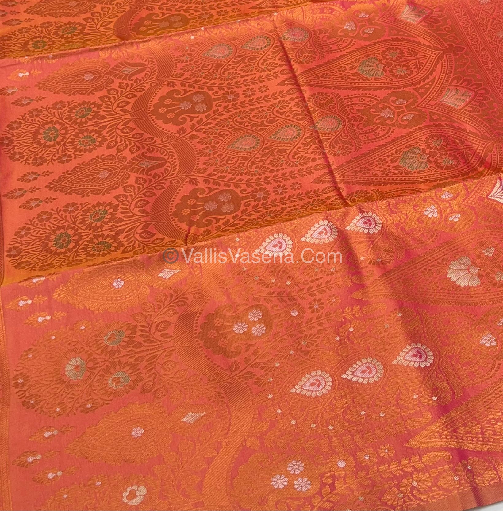 Semi Soft Silk Saree. Double tone color , Very very soft texture.All over silver and copper Zari Butta . Rich Pallu with tassels and Brocade blouse and border for sleeves .