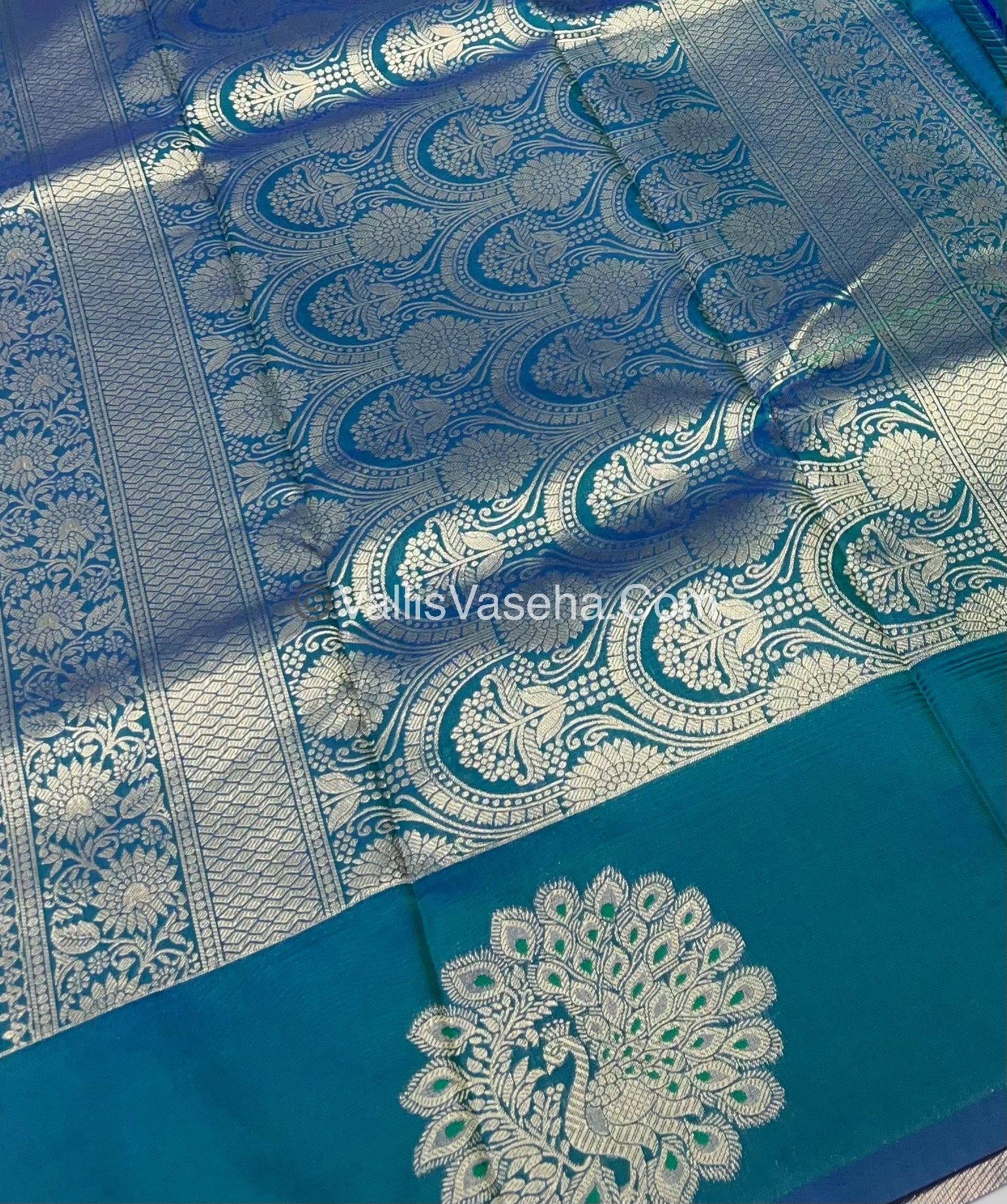 Semi Soft Silk - Peacock Butta Border - Peacock Blue Shade -VVSSS011