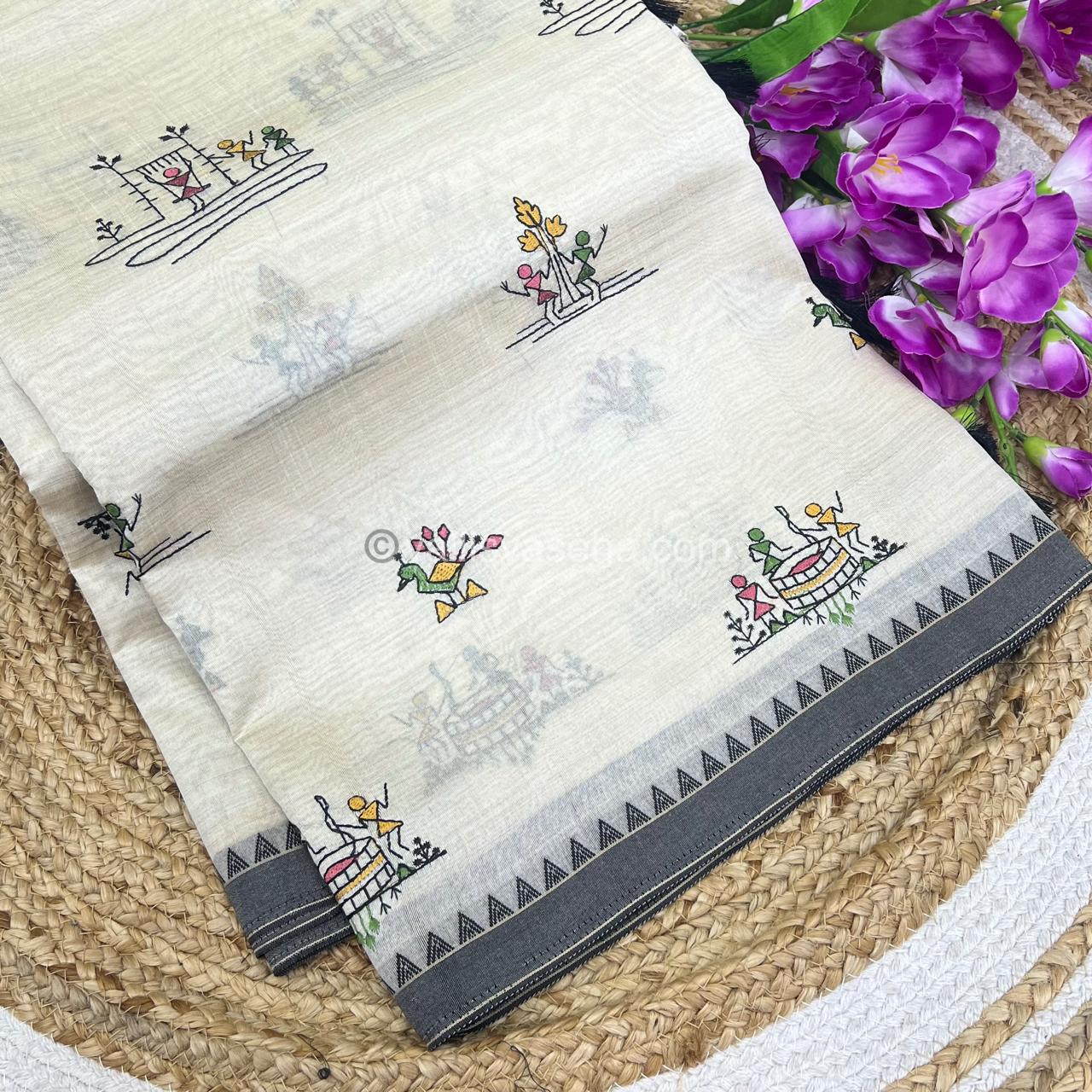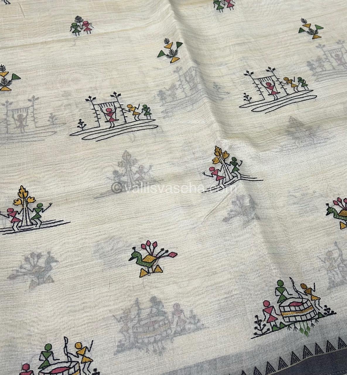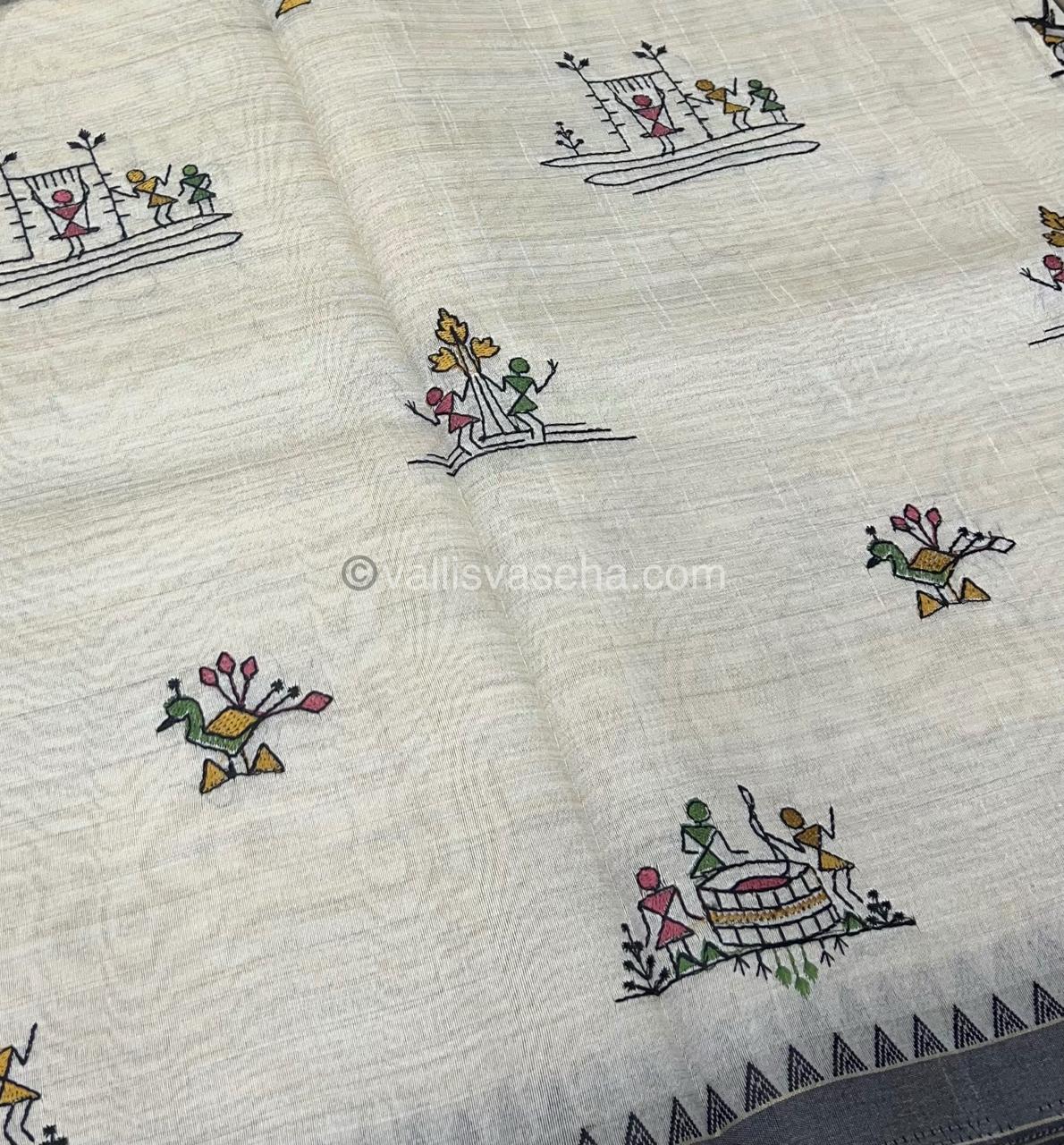 Semi Tussar  Saree  with all over Embroidery ( Varli / Floral / Kalamkari )design and small Temple design in borders with Running Pallu with tassels and running Plain blouse with same border for sleeves