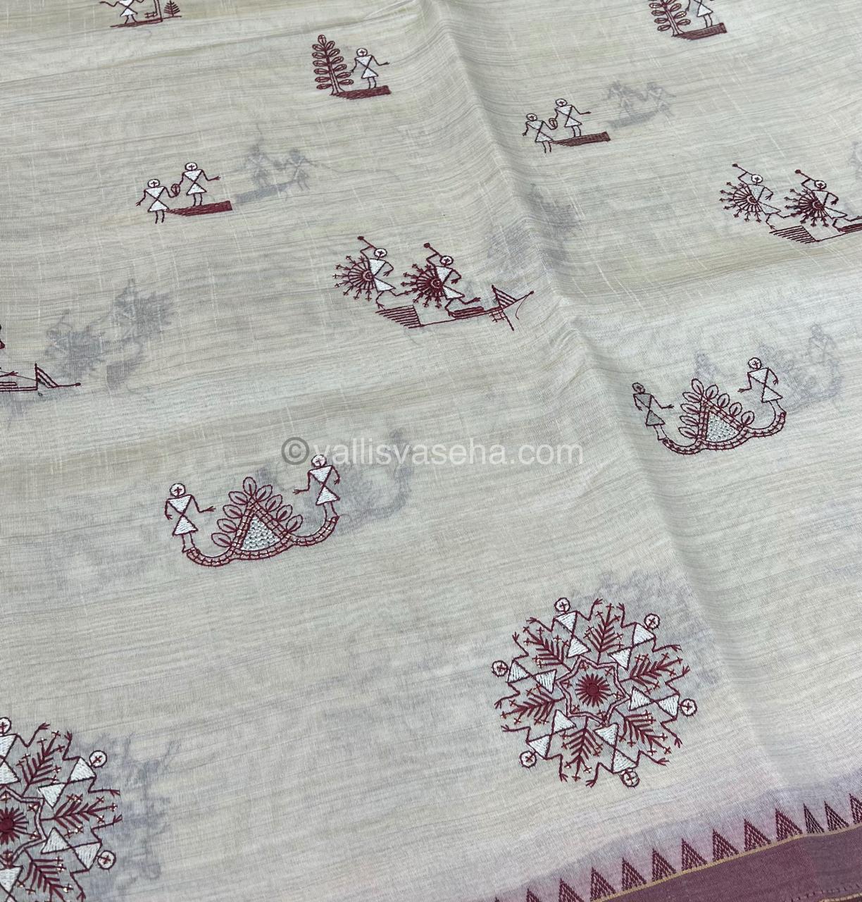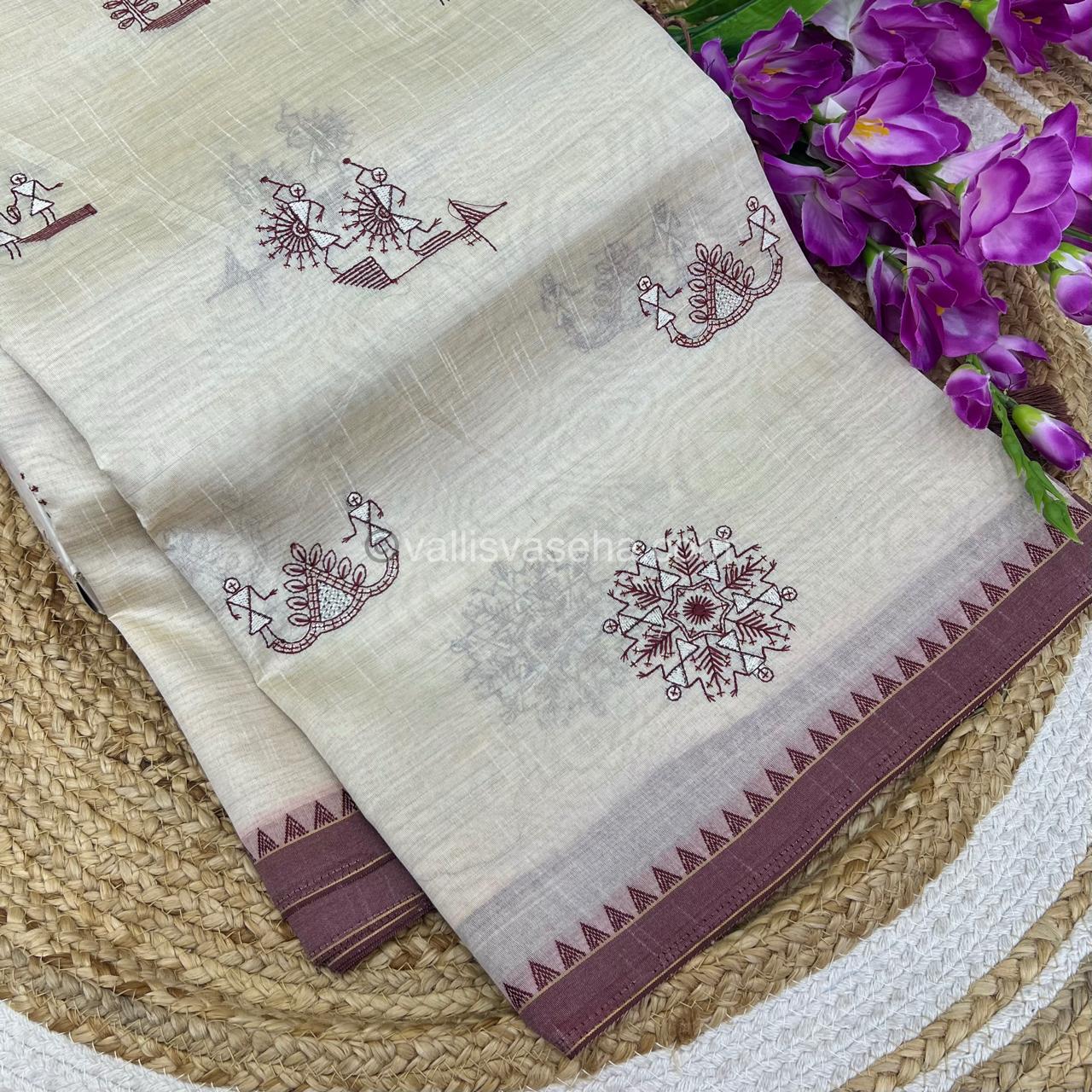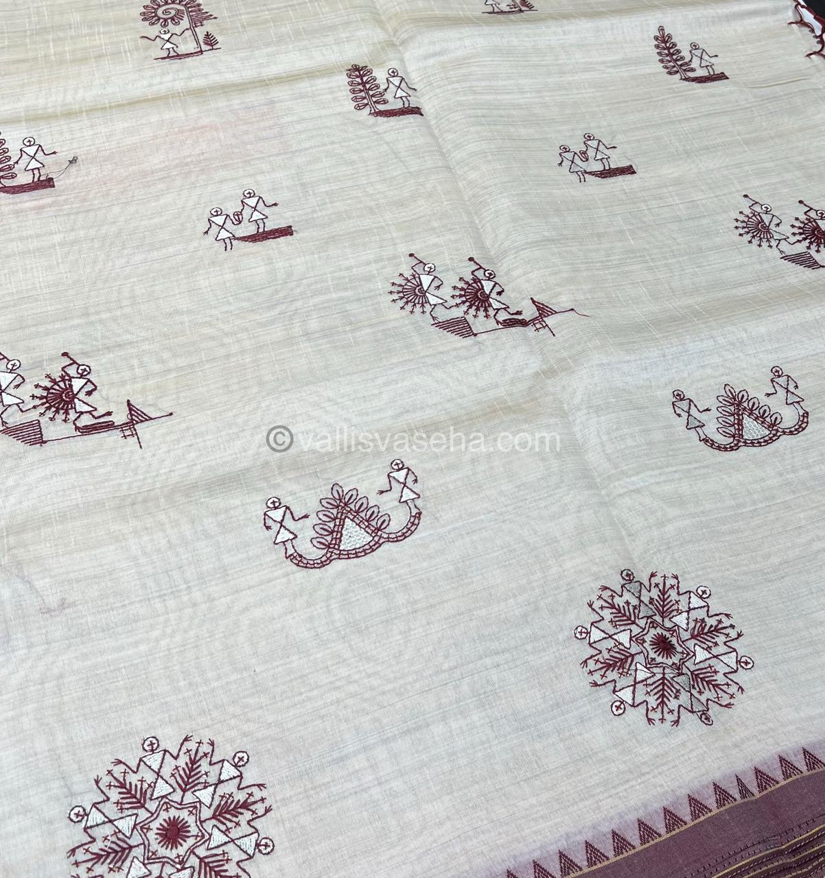Semi Tussar  Saree  with all over Embroidery ( Varli / Floral / Kalamkari )design and small Temple design in borders with Running Pallu with tassels and running Plain blouse with same border for sleeves