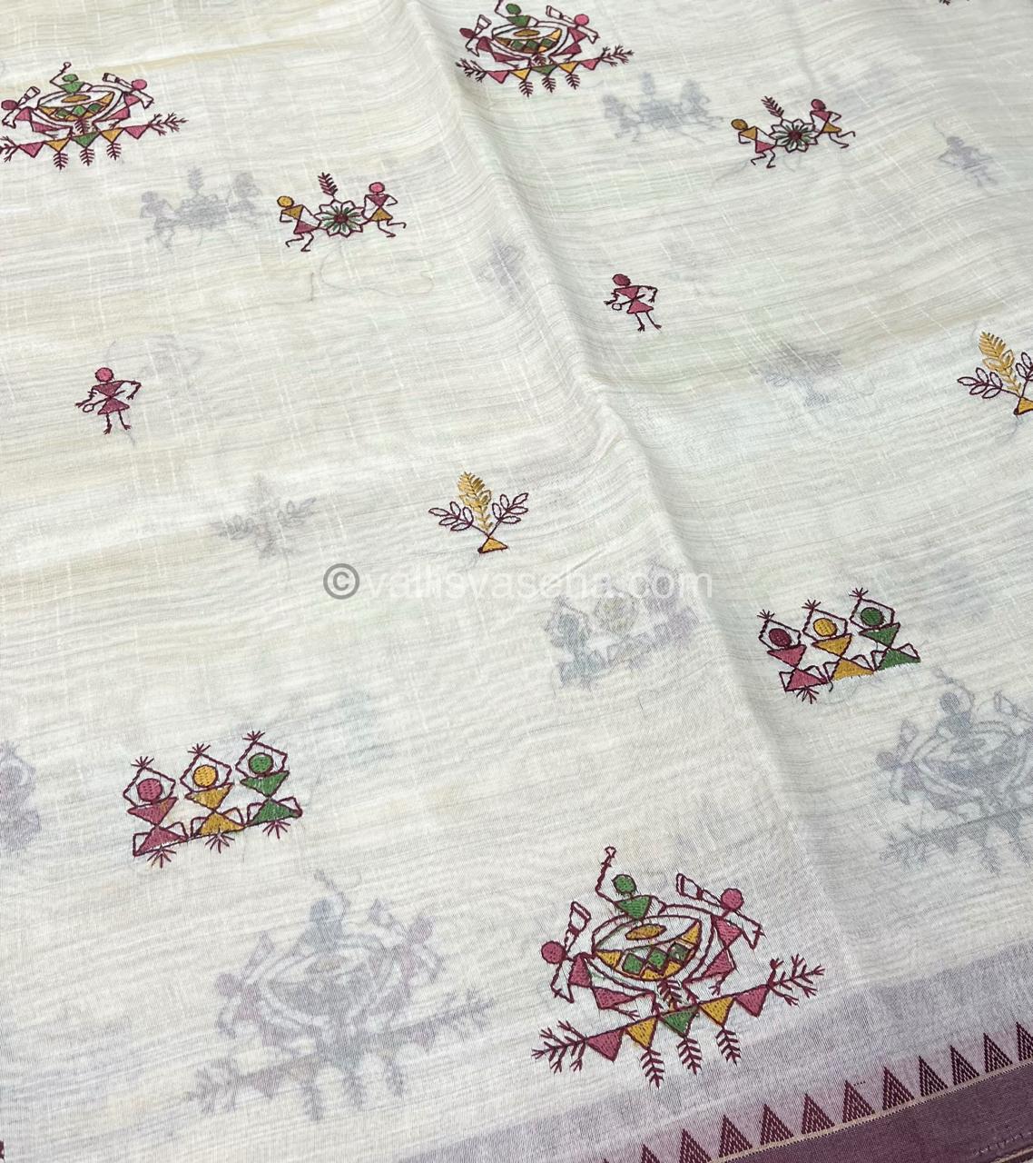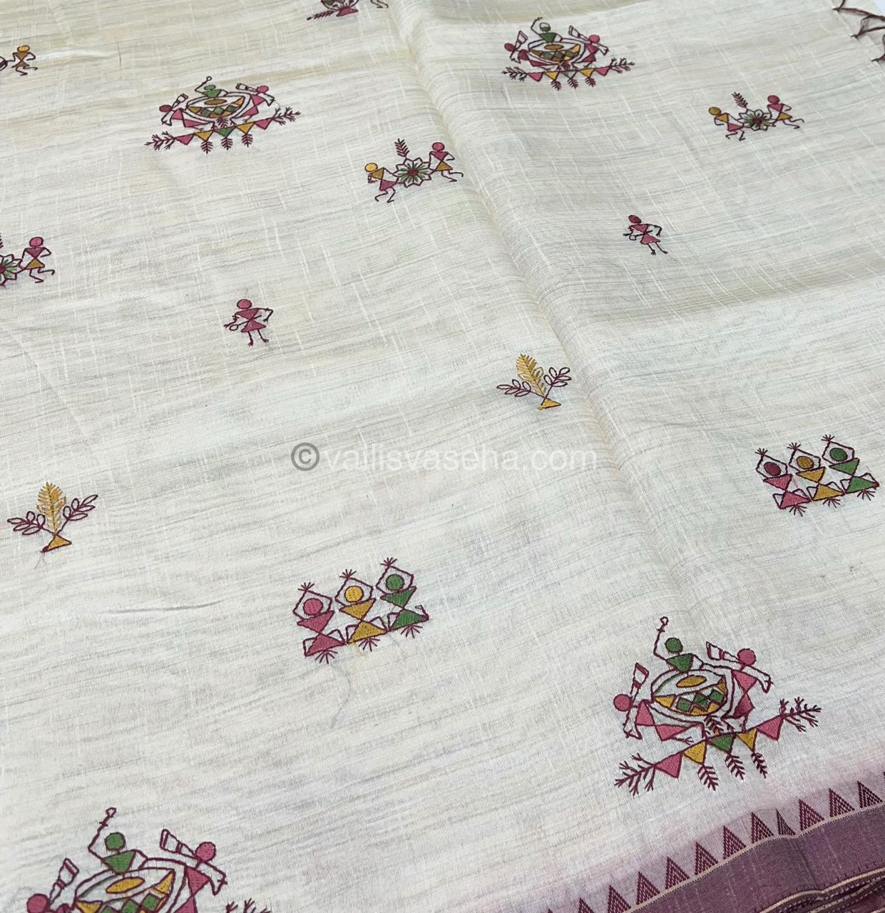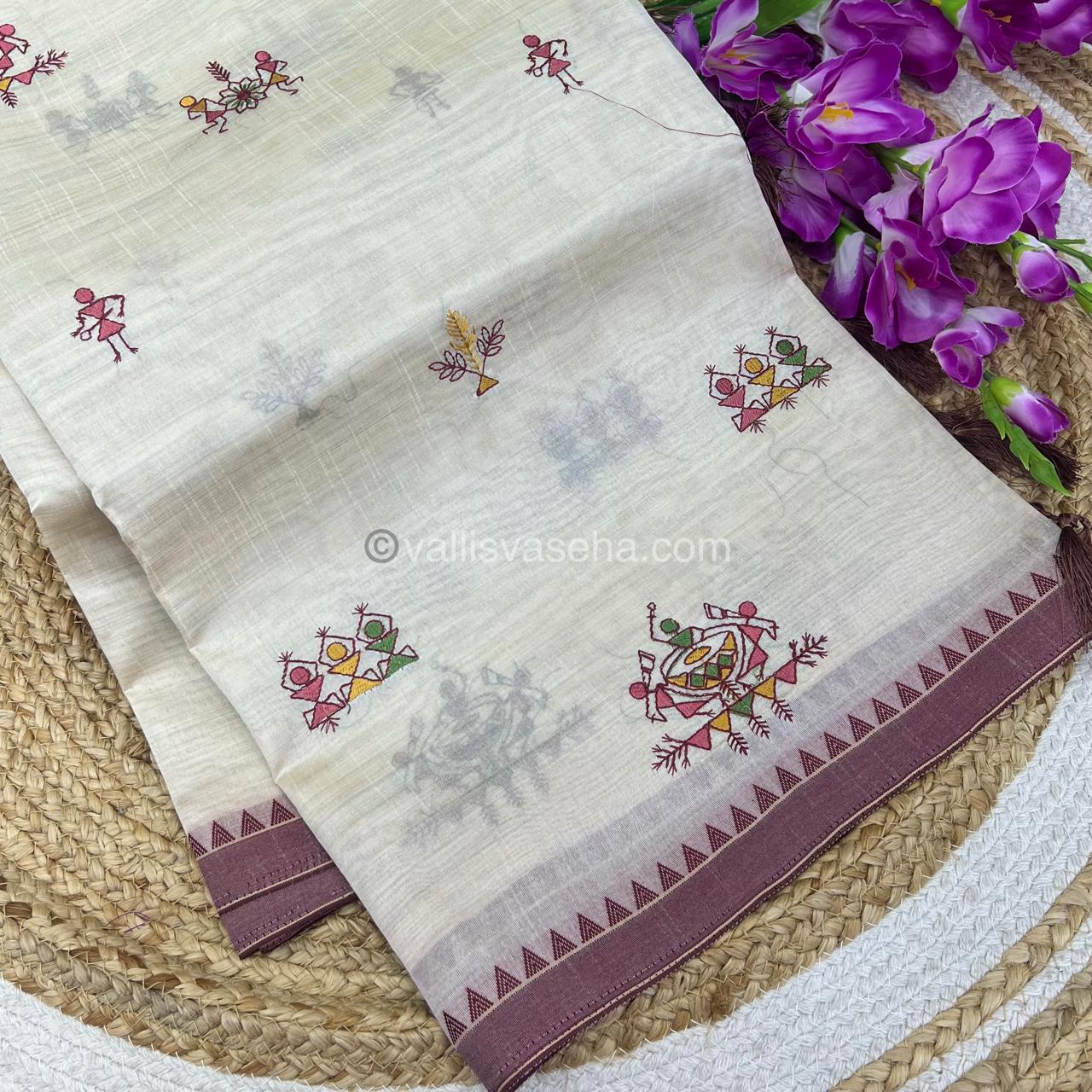 Semi Tussar Saree with all over Embroidery ( Varli / Floral / Kalamkari )design and small Temple design in borders with Running Pallu with tassels and running Plain blouse with same border for sleeves