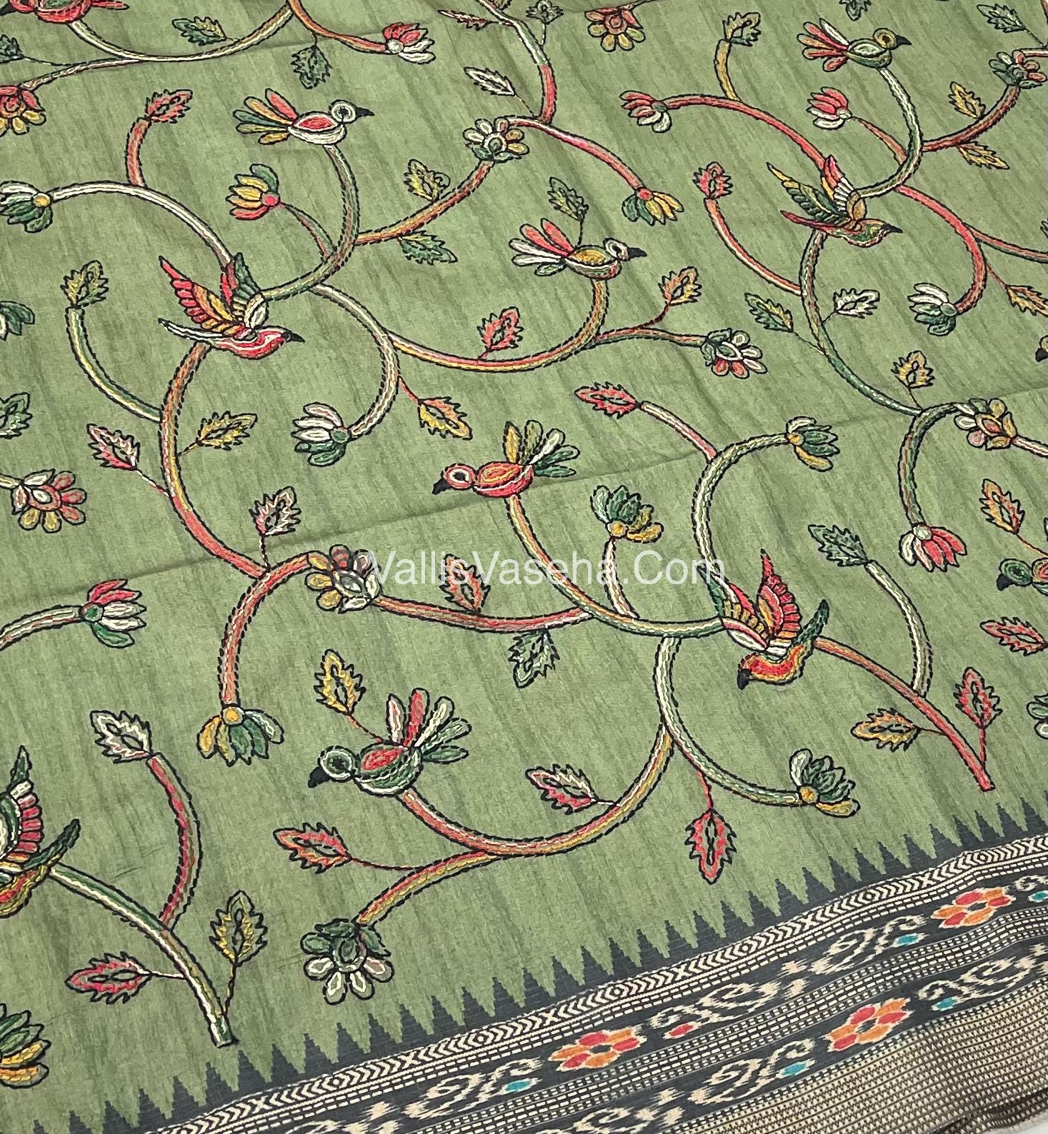 Semi Tussar Saree with all over Kantha Work Embroidery Kodi pattern ( Birds / elephant) design and Ikkat / Pochampally design in borders with Rich Pallu and Printed blouse with same border for sleeves
