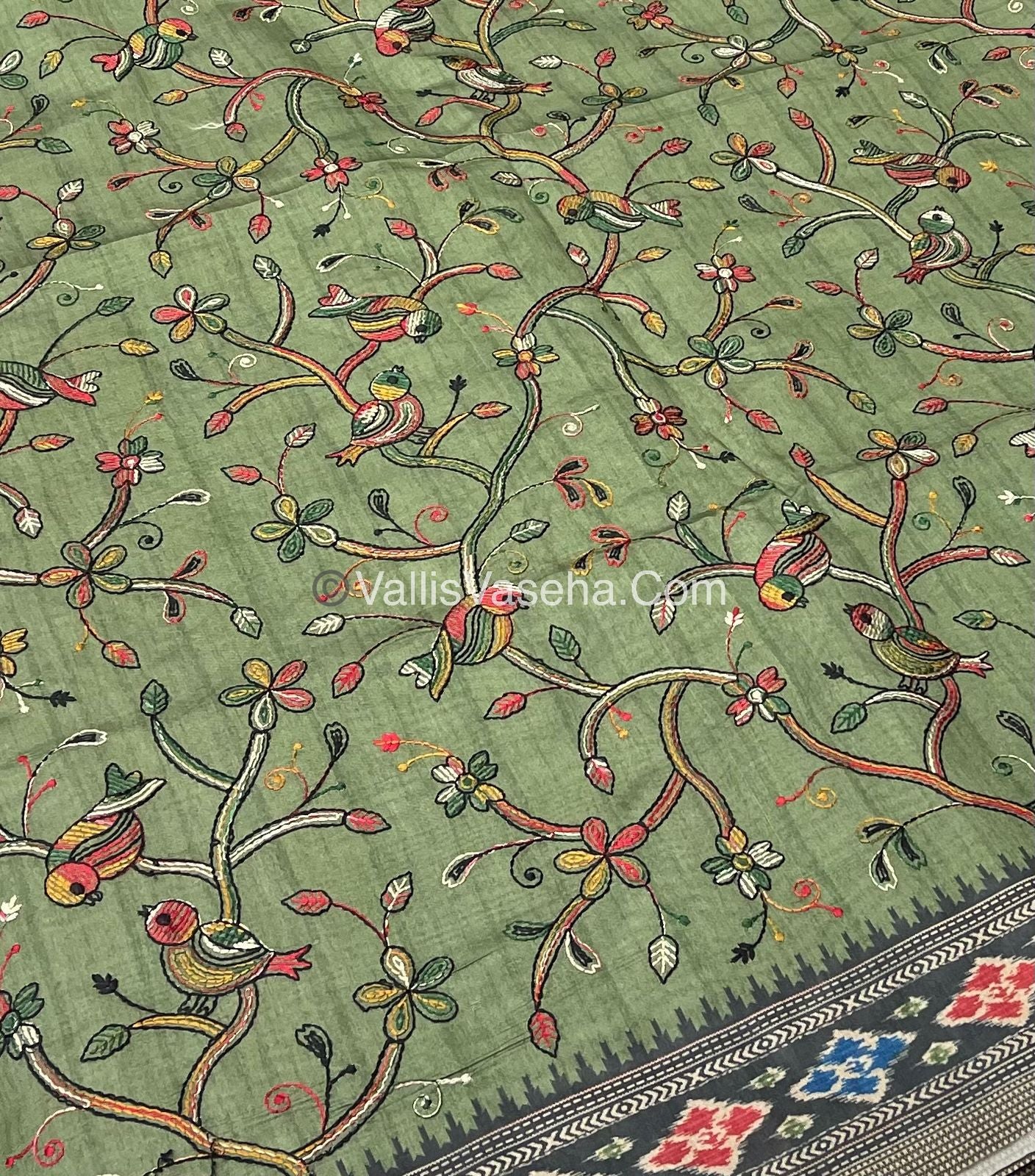 Semi Tussar Saree with all over Kantha Work Embroidery Kodi pattern ( Birds / elephant) design and Ikkat / Pochampally design in borders with Rich Pallu and Printed blouse with same border for sleeves