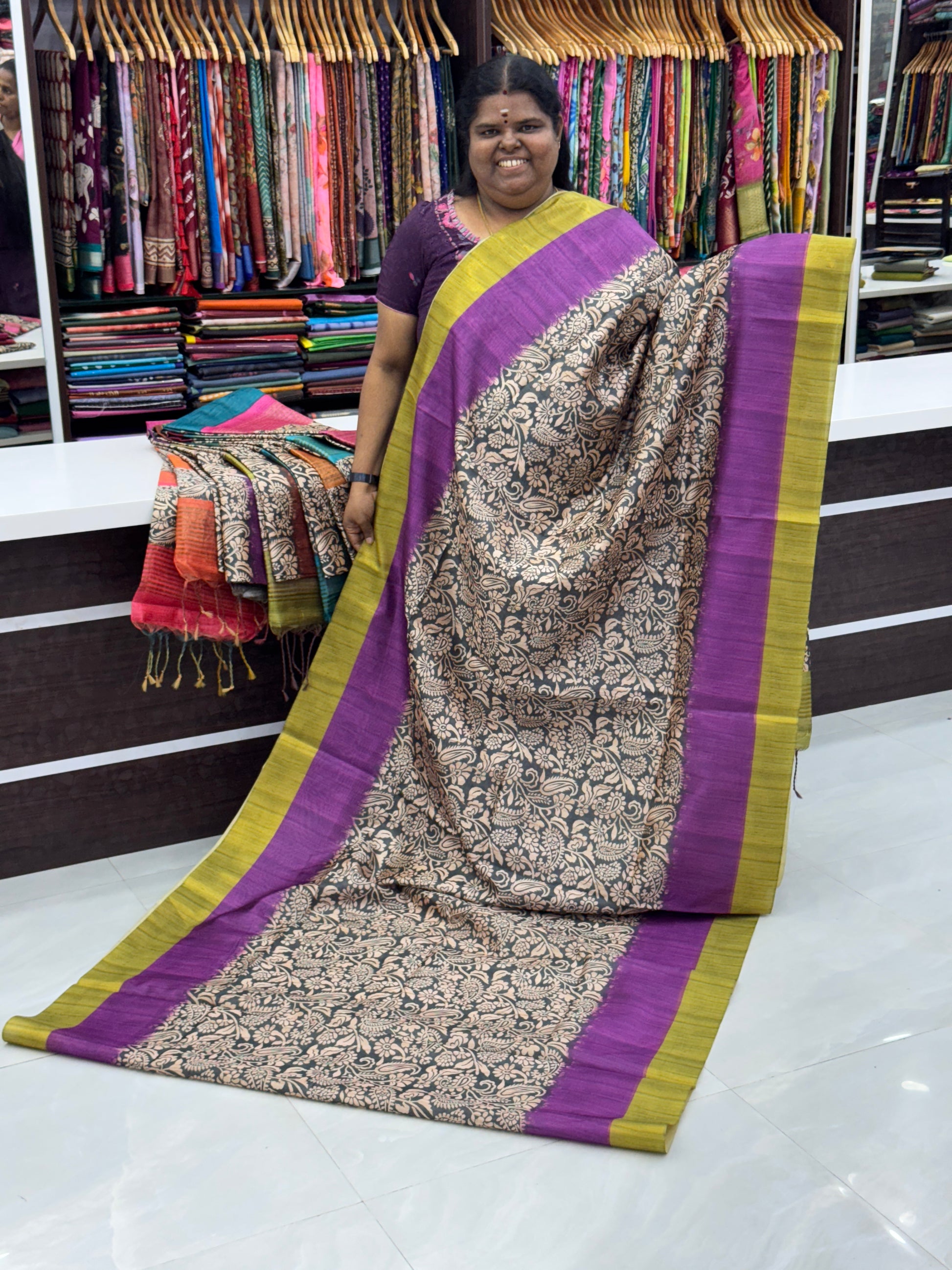 Casual Wear Sarees:- Semi Tussar - Soft Finish with 2 Color Border , Printed Pallu with tassels and Blouse .