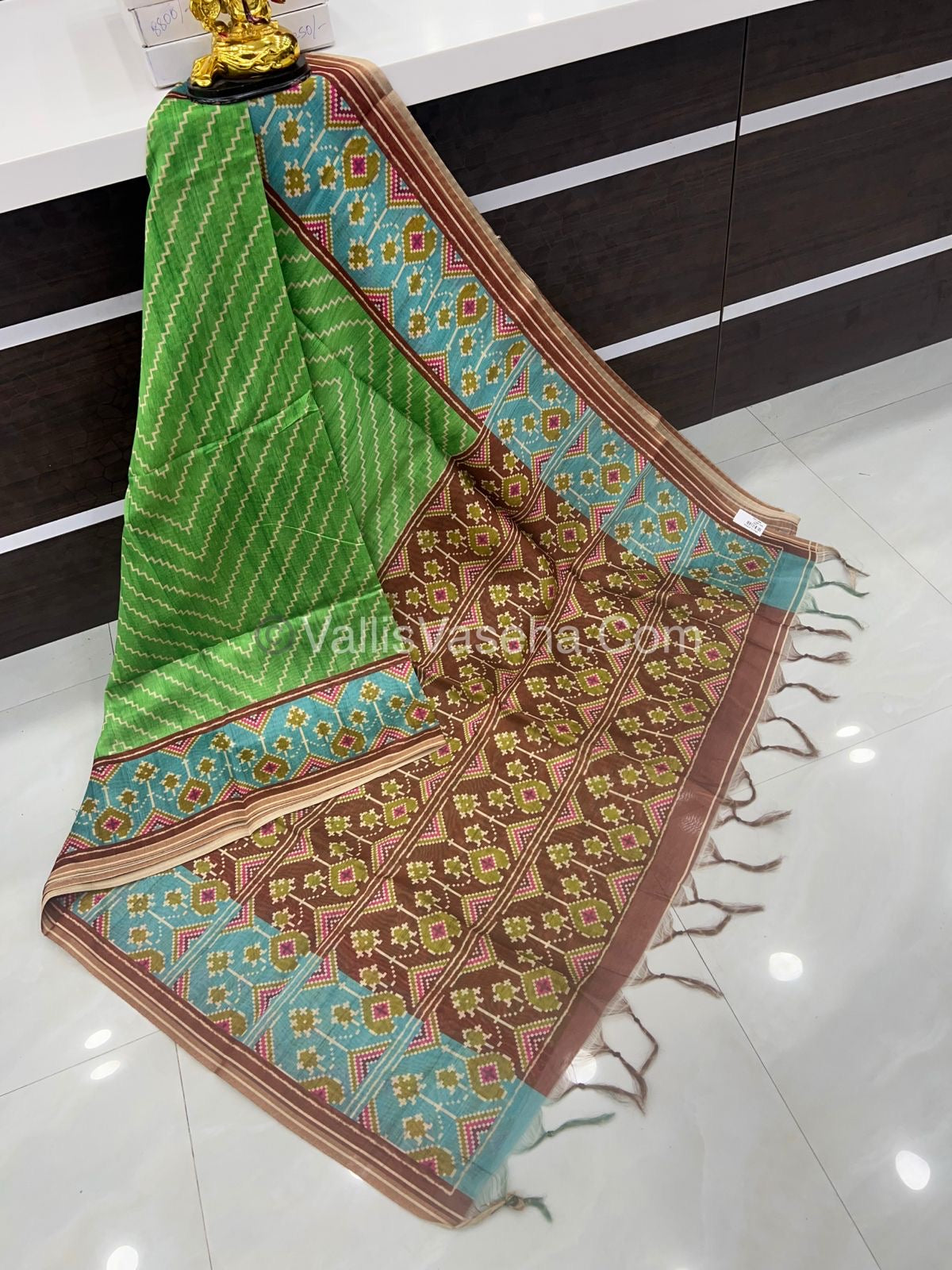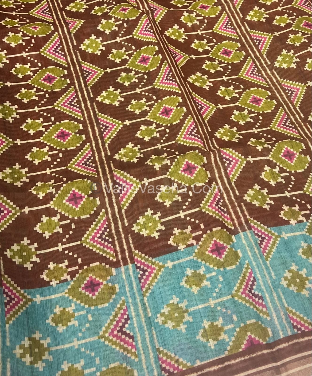 Semi Tussar Saree with beautiful waves pattern in body with Patola design border. Contrast Printed Pallu and contrast Blouse .