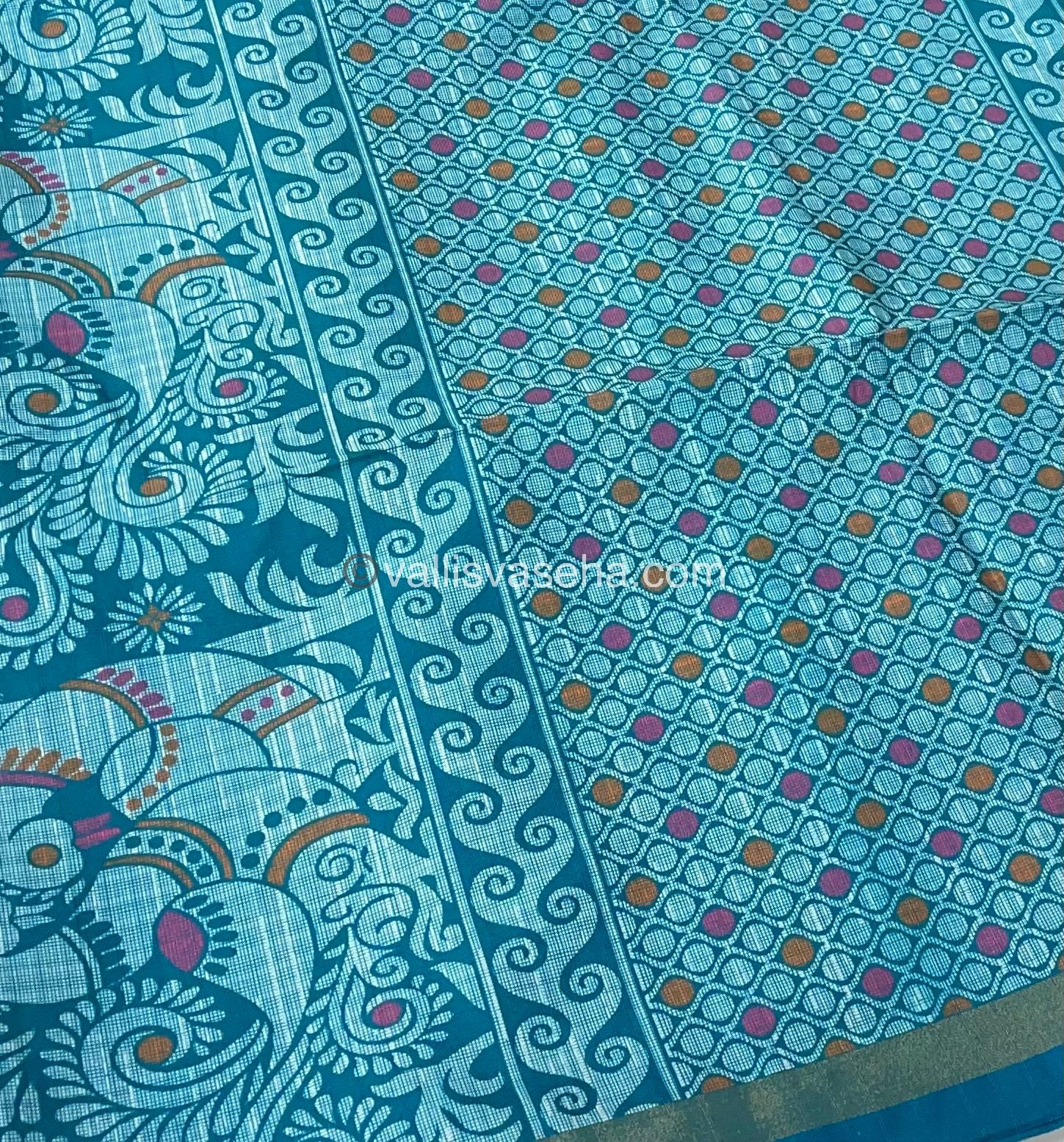Semi Tussar / Semi Chappa Silk |Peacock Design | - Cream & Ramar Blue Combo - VVSTS018