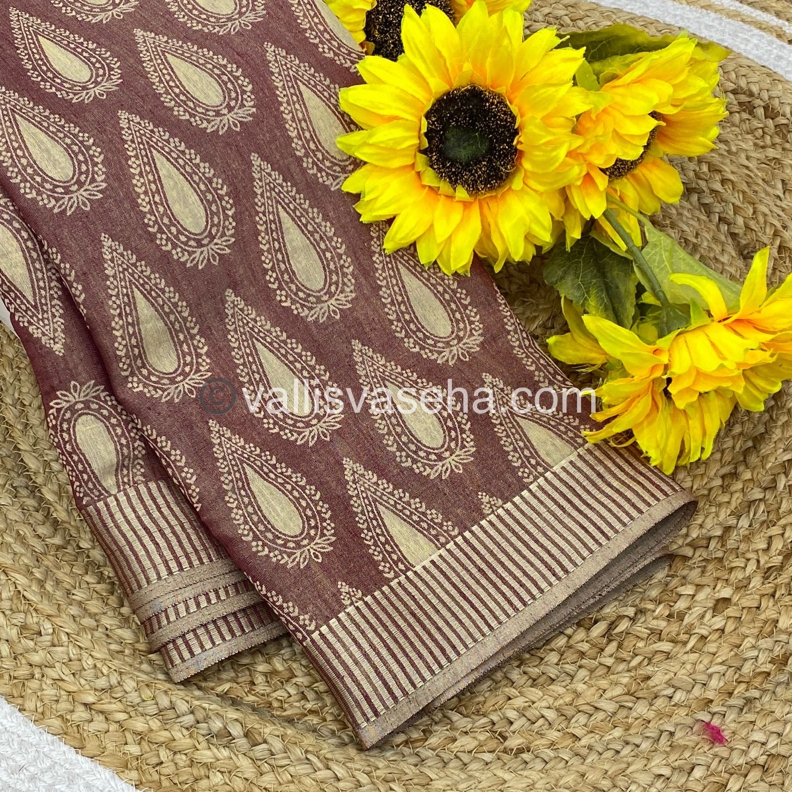 Semi Tussar Silk Saree with tissue finish and all over Thilagam design Weaving and stripes borders with stripes Pallu and running blouse.