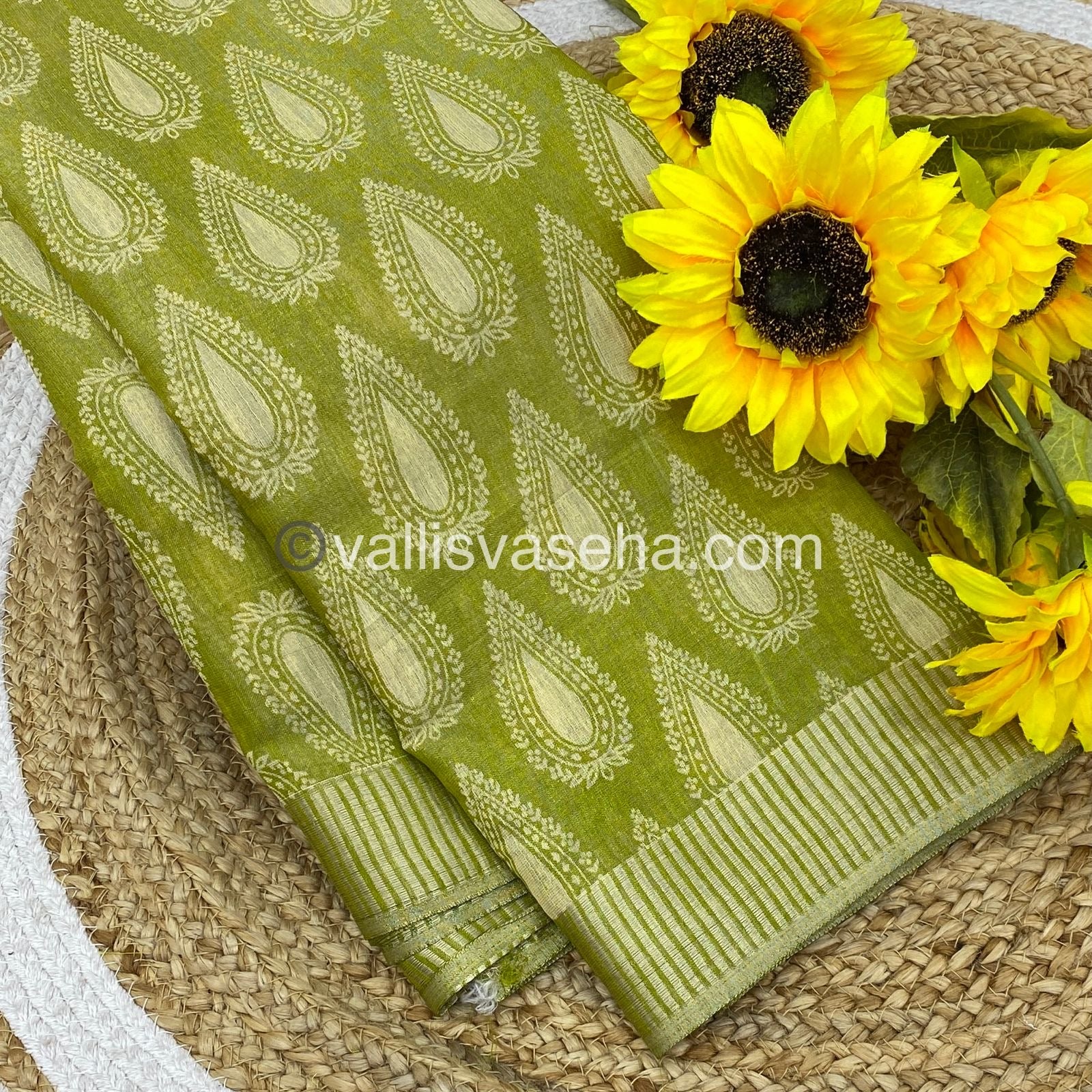 Semi Tussar Silk Saree with tissue finish and all over Thilagam design Weaving and stripes borders with stripes Pallu and running blouse.