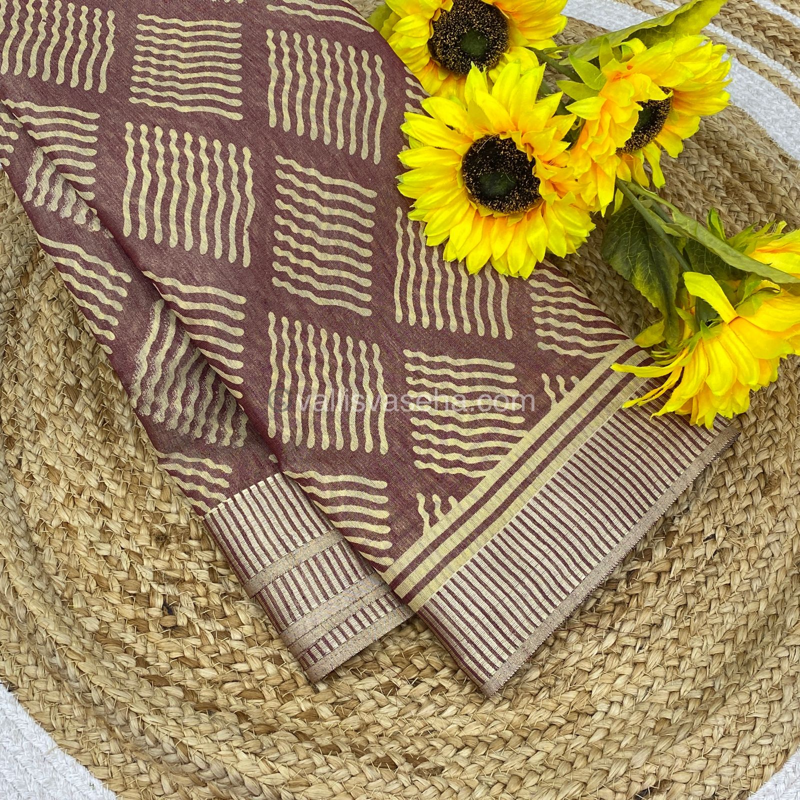 Semi Tussar Silk Saree with tissue finish and all over geometrical design Weaving and stripes borders with stripes Pallu and running blouse.