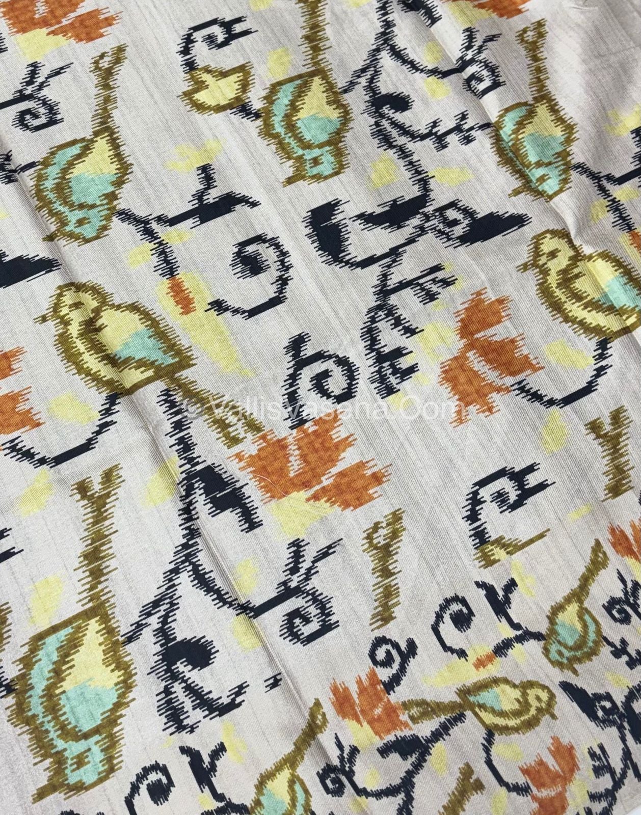 Semi Tussar Silk Saree / Semi Raw Silk Finish - all over the saree Double Lines Checks design with contrast Cream with Kalamkari birds design borders ,contrast printed pallu and contrast printed Blouse.