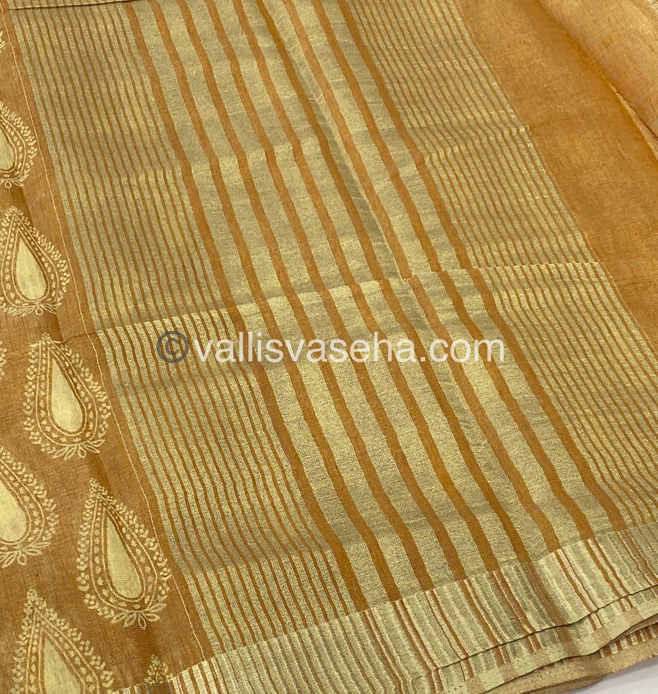 Semi Tussar Silk Saree with tissue finish and all over Thilagam design Weaving and stripes borders with stripes Pallu and running blouse.