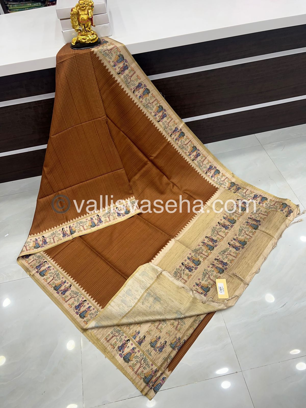 Semi Tussar Silk Saree / Semi Raw Silk Finish - vairavoosi design all over the saree with contrast story telling printed border with thin strip of Zari woven borders , contrast jute style weaving printed Pallu and Printed blouse.