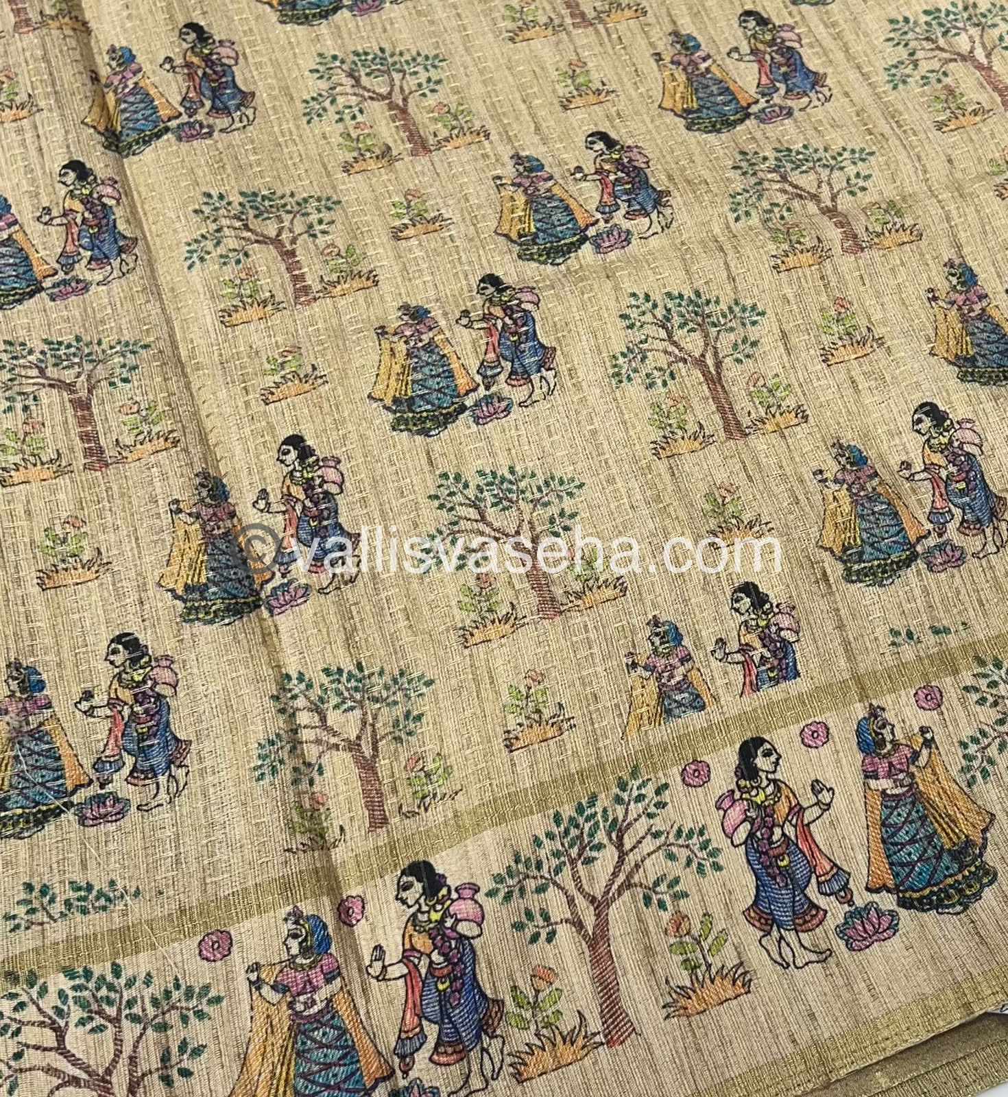 Semi Tussar Silk Saree / Semi Raw Silk Finish - vairavoosi design all over the saree with contrast story telling printed border with thin strip of Zari woven borders , contrast jute style weaving printed Pallu and Printed blouse.