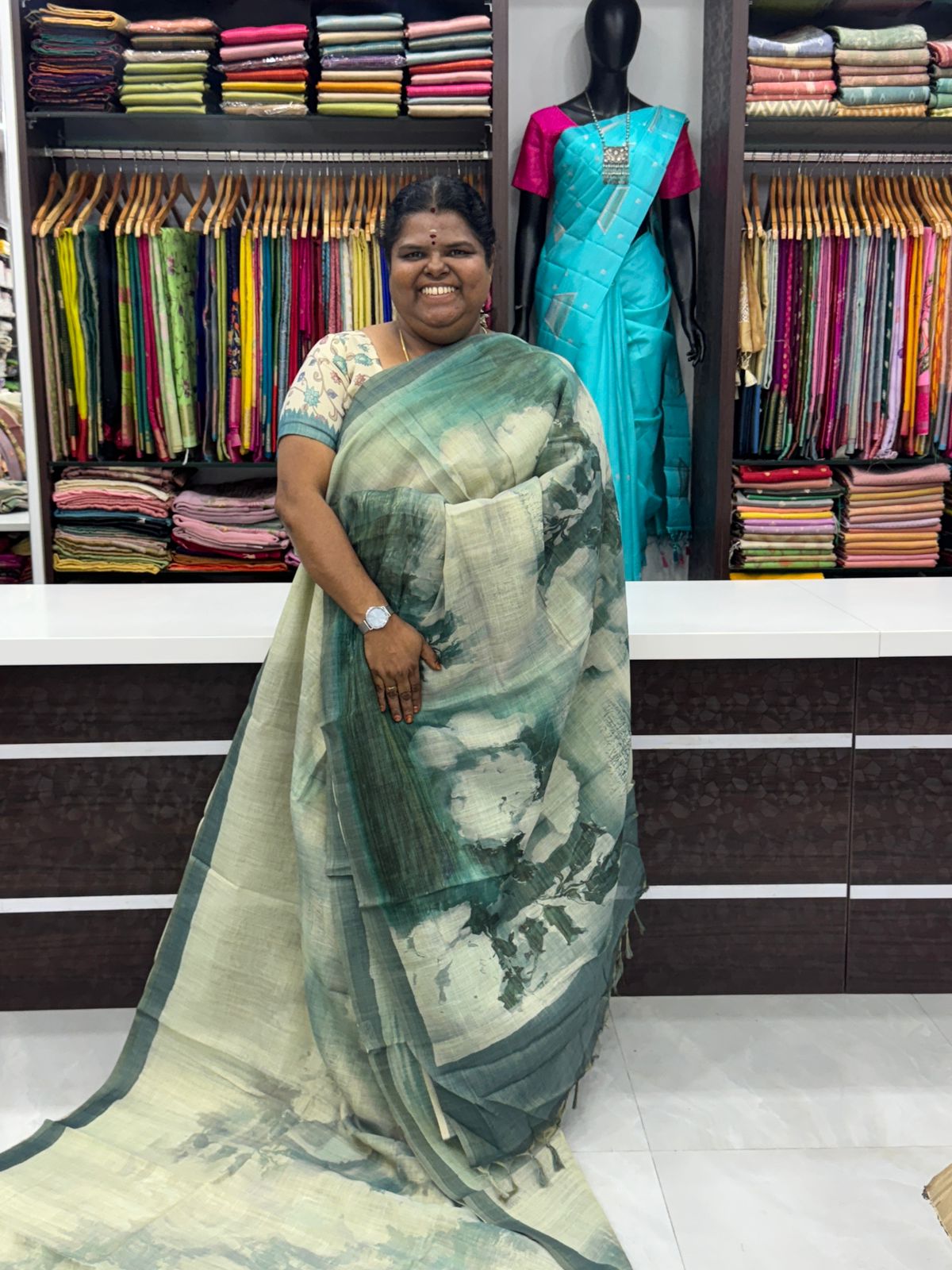 Tissue Linen Saree - Contemporary designs - Cloud design all over the saree with similar pattern and contrast blouse - Occasional wear…