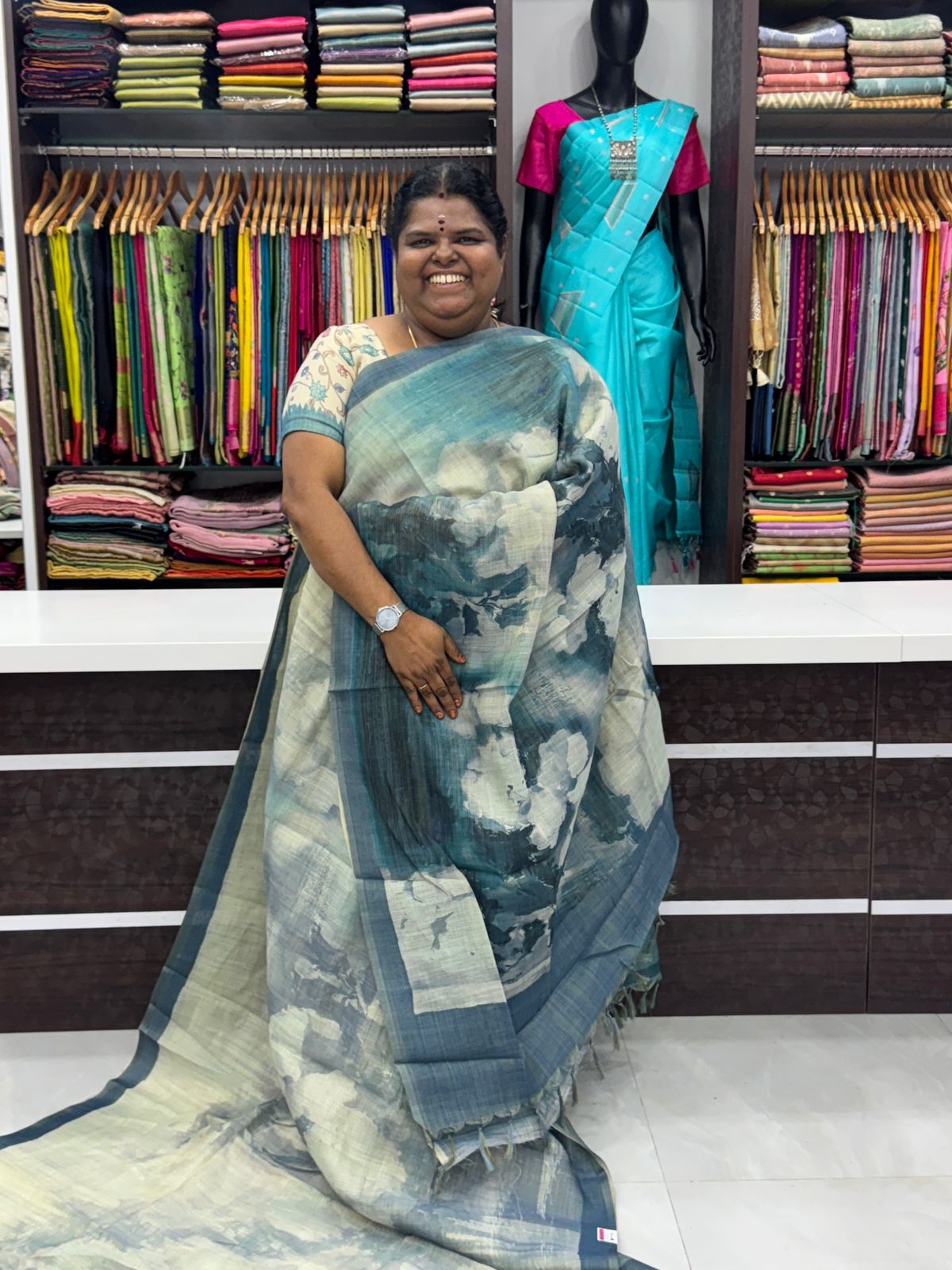 Tissue Linen Saree - Contemporary designs - Cloud design all over the saree with similar pattern and contrast blouse - Occasional wear…