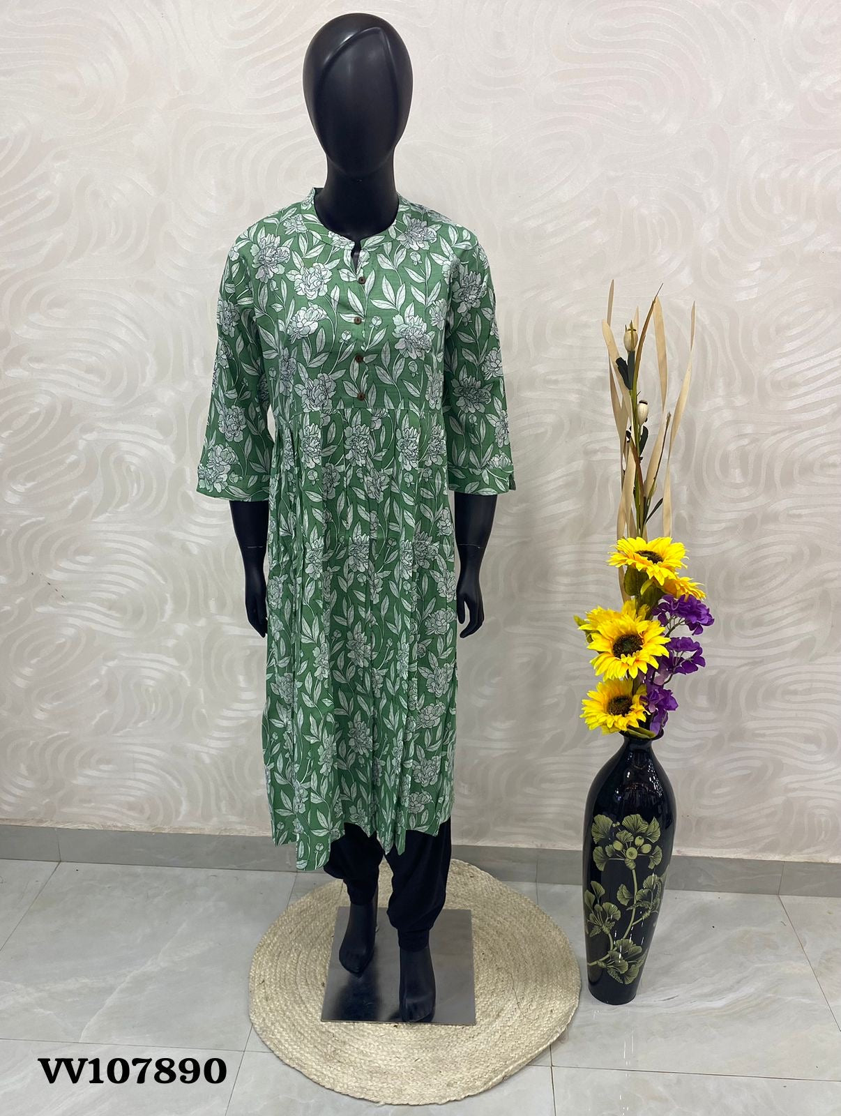 Umbrella Slub Cotton Printed Kurti - Green Shade - VV107890
