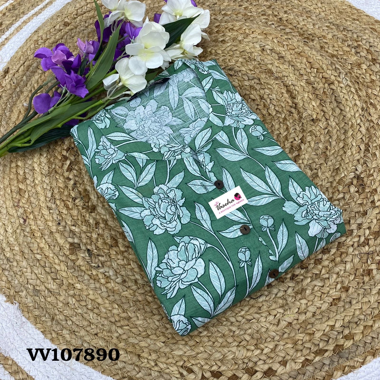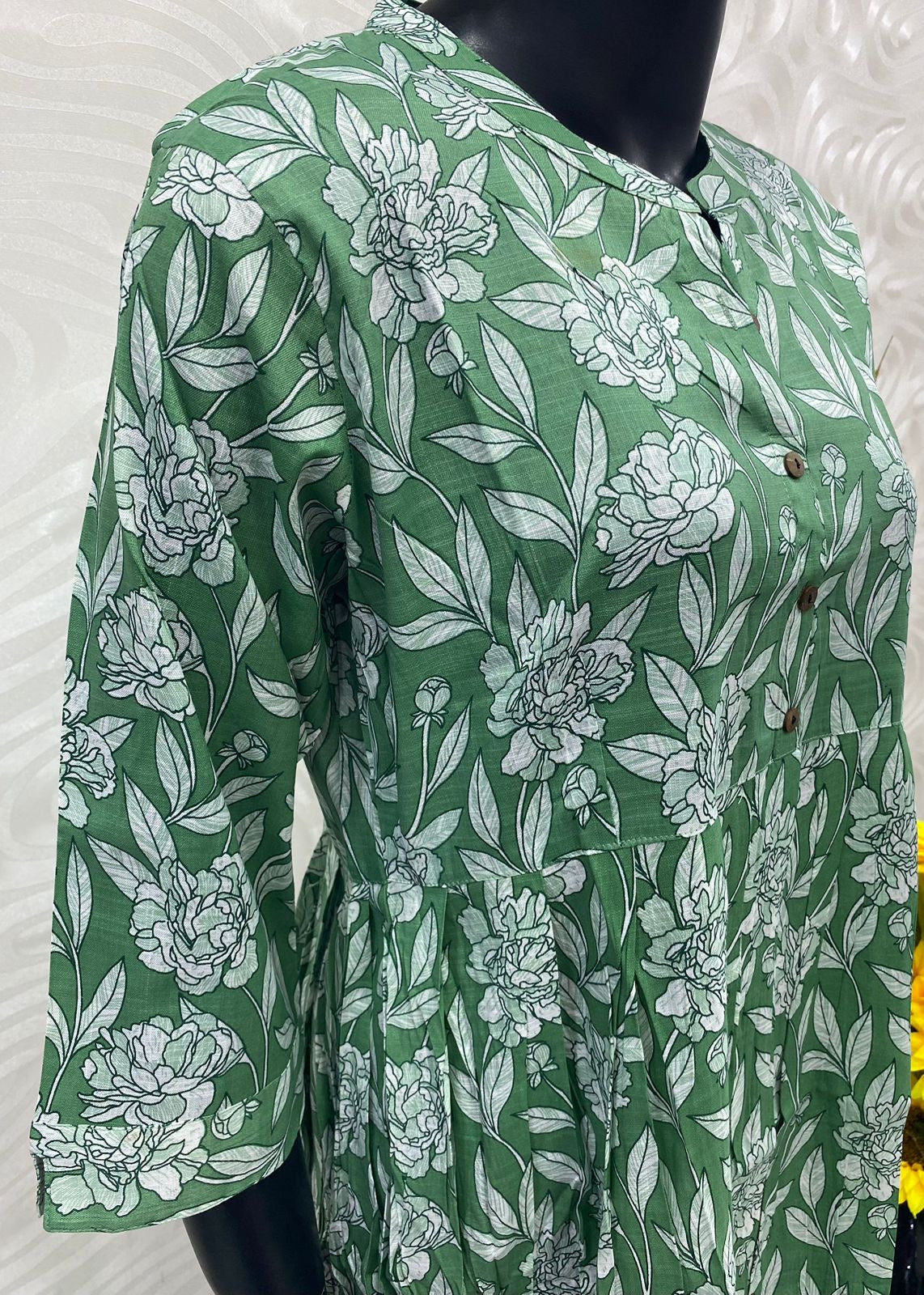 Soft Slub Cotton - Green Shade - Umbrella Style - Printed Kurti With 3/4th Hand Sleeves and front button with collar neck . Only Kurti - Regular Wear / Office Wear.