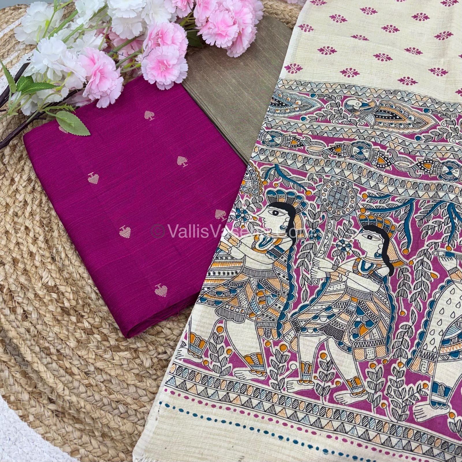 Unstitched Salwar Material -Raw Silk - Rani Pink & Cream Shade - VVUSM013